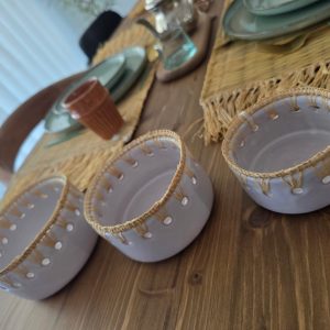 Entièrement faits main au Maroc, ces 3 bols en céramique sont bordés d’un délicat tressage en raphia naturel.