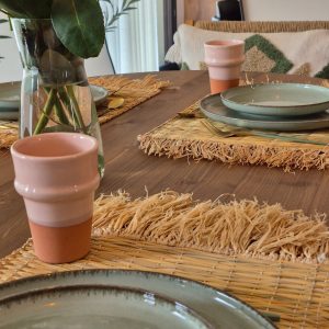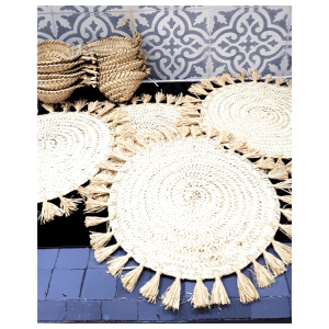 Set de table rond en paille et raphia naturel, fait main par des artisans marocains. Idéal pour une décoration de table bohème et chaleureuse.