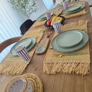 Set de table rectangulaire artisanal en feuille de palmier et raphia, fait main au Maroc. Une touche naturelle et bohème pour sublimer votre table.