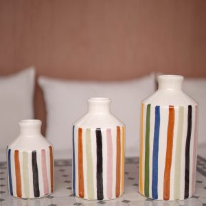 Apportez une touche de couleur et d’authenticité à votre intérieur avec ce vase en céramique rayé multicolore, idéal pour accueillir de fleurs fraîches, fleurs séchées ou simplement comme objet décoratif à part entière.