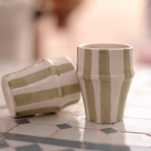 Verre artisanale en céramique blanche motif rayures vert sauge – fait main Ce verre en céramique fait main séduit par ses rayures vert sauge délicates et sa forme douce, agréable en main. Il s’intègre facilement à différents styles de vaisselle et peut être utilisé aussi bien au quotidien que pour recevoir. Chaque verre est une…