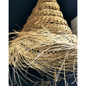 Suspension Soleil de l’Atlas en fibre naturelle tressée. Forme étoilée spectaculaire et tressage ajouré pour une lumière douce et une ambiance chaleureuse.