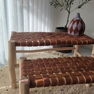 Banc artisanal en bois et cuir tressé coloris caramel, décliné en petit et moyen format pour sublimer une décoration bohème et élégante.