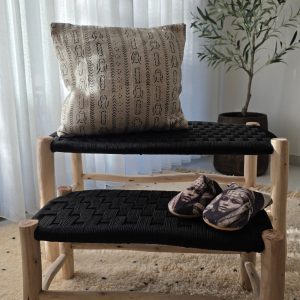 Banc artisanal en bois et tressage noir, décliné en petit et moyen format pour apporter une touche élégante et naturelle à votre intérieur.