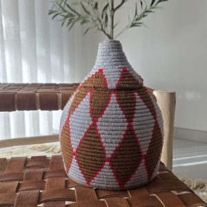 Corbeille berbère artisanale en fibre naturelle tressée, ornée de motifs géométriques marron et gris. Une pièce faite main, à la fois décorative et fonctionnelle, idéale pour une décoration bohème, chaleureuse et authentique.