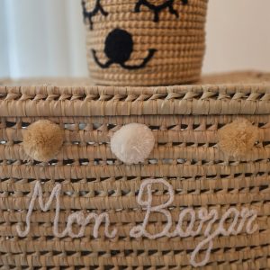 La malle personnalisée MON BAZAR, faite main en fibres naturelles, est une pièce artisanale unique qui allie rangement, décoration et authenticité.