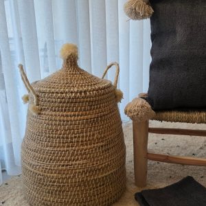 79,00 €Grande panière artisanale en fibres naturelles avec pompons et anses amovibles, idéale pour un rangement déco bohème et chaleureux.