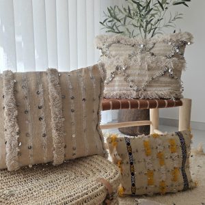 Housse de coussin handira artisanale en coton tissé à la main, aux tons ocre et sable, rehaussée de sequins brodés à la main. Une pièce décorative authentique, chaleureuse et lumineuse, idéale pour une décoration bohème chic.