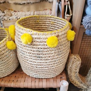 Panière tressée à la main en fibres naturelles avec pompons jaunes, idéale pour ranger petits objets tout en apportant une touche bohème chaleureuse à votre intérieur.