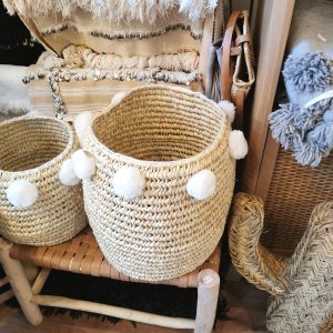 Panière tressée à la main en fibres naturelles avec pompons blancs, idéale pour ranger petits objets tout en apportant une touche bohème douce à votre intérieur.