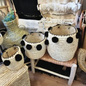 Panière tressée à la main en fibres naturelles avec pompons noirs, idéale pour ranger et décorer avec une touche bohème élégante et contrastée.