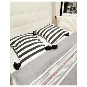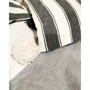 Housse de coussin artisanale en coton tissé, aux nuances de gris doux, agrémentée de finissions faites main. Une pièce sobre et élégante, idéale pour une décoration bohème, naturelle et intemporelle.
