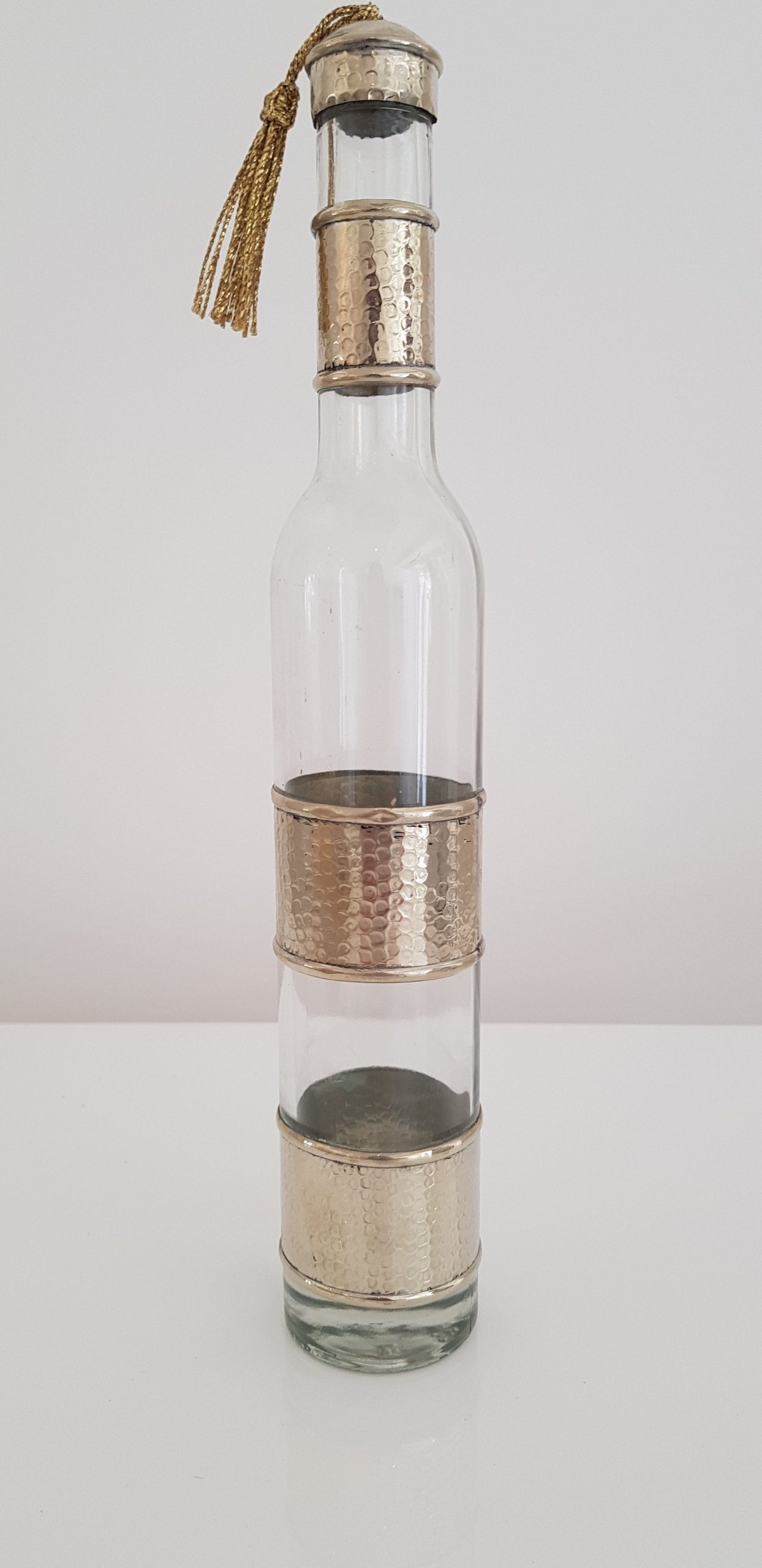 Bouteille en verre artisanale avec motif argent martelé