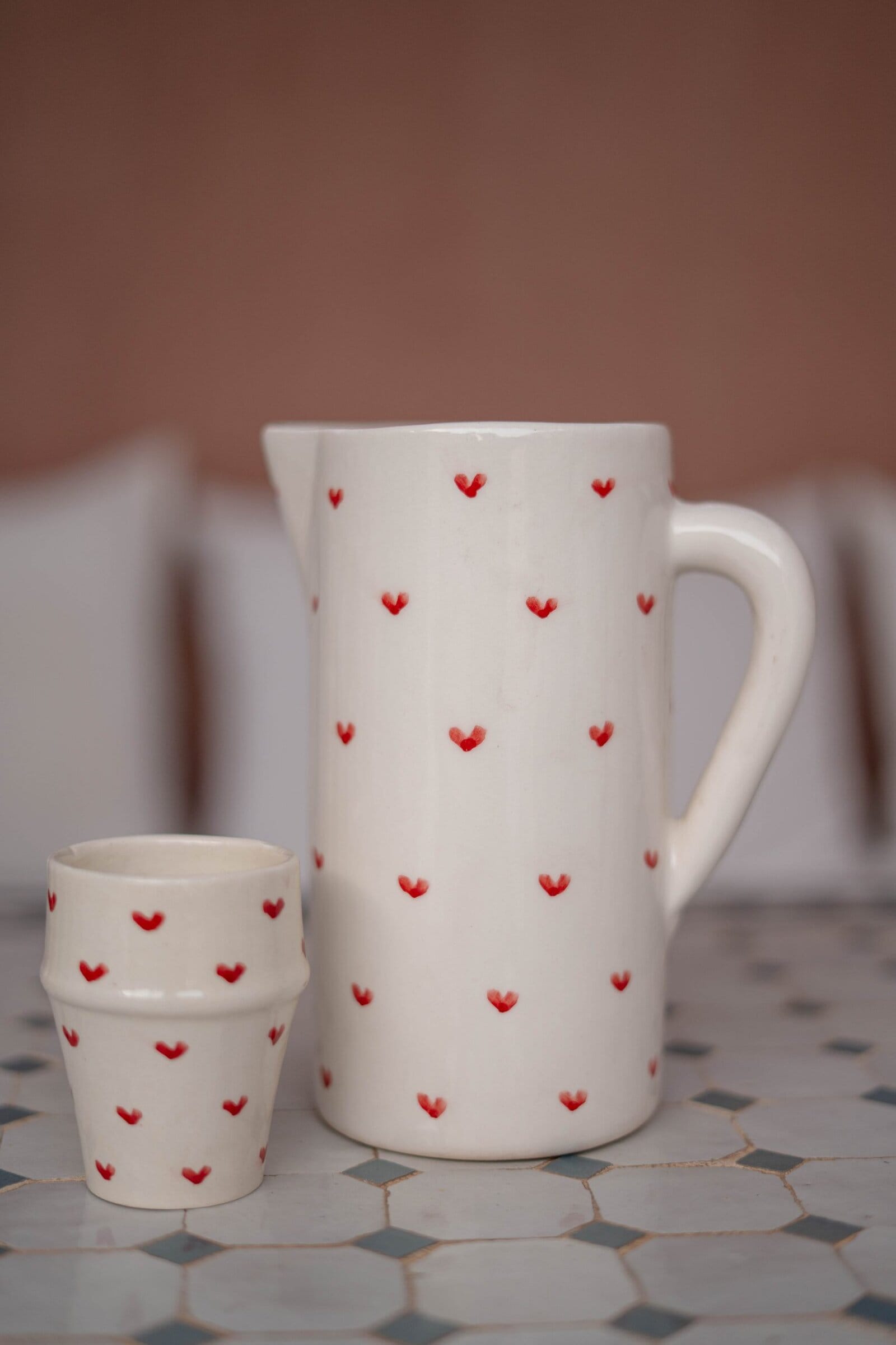 Apportez une touche de douceur à votre table avec cette carafe artisanale en céramique, décorée de petits cœurs rouges peints à la main. Une pièce unique, idéale pour le quotidien comme pour les jolies tables.