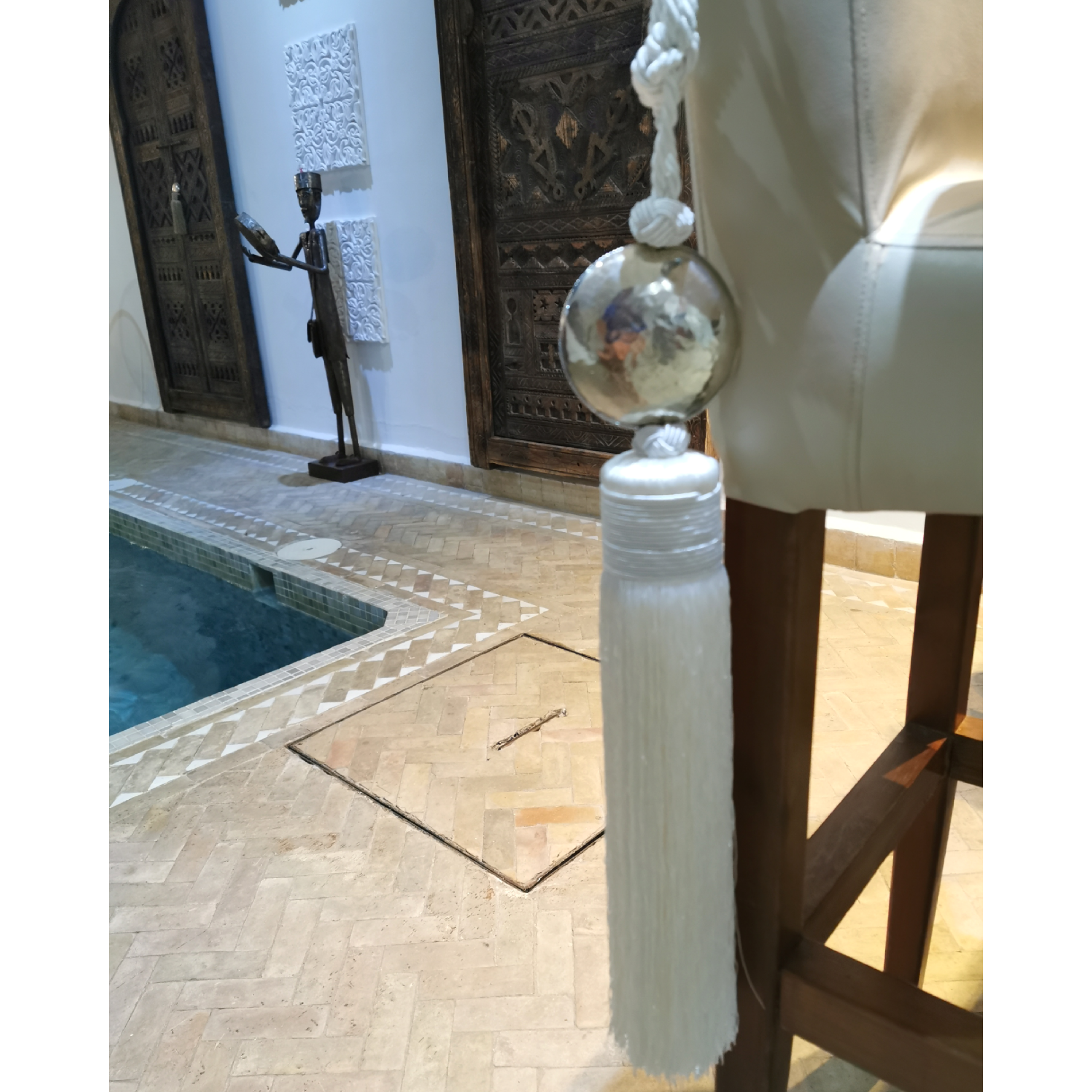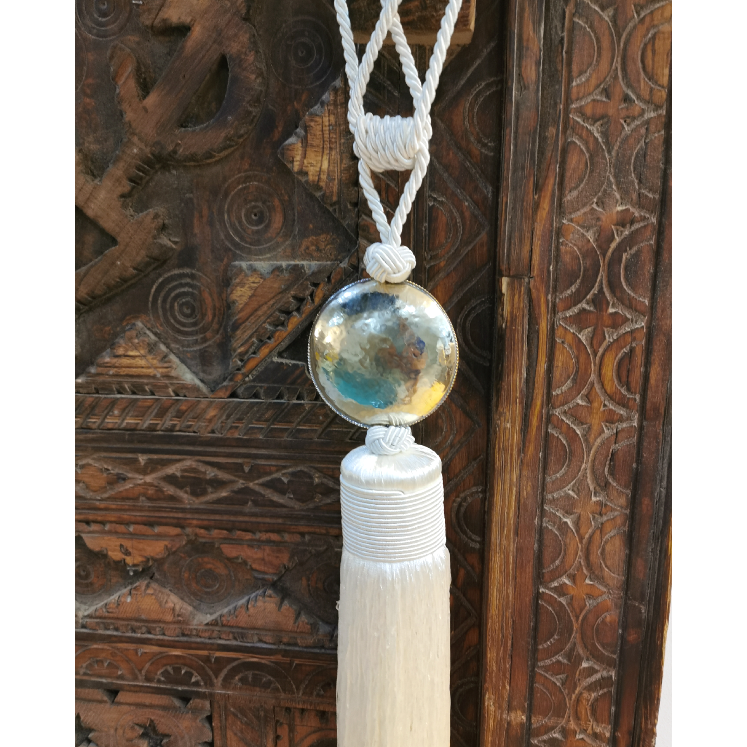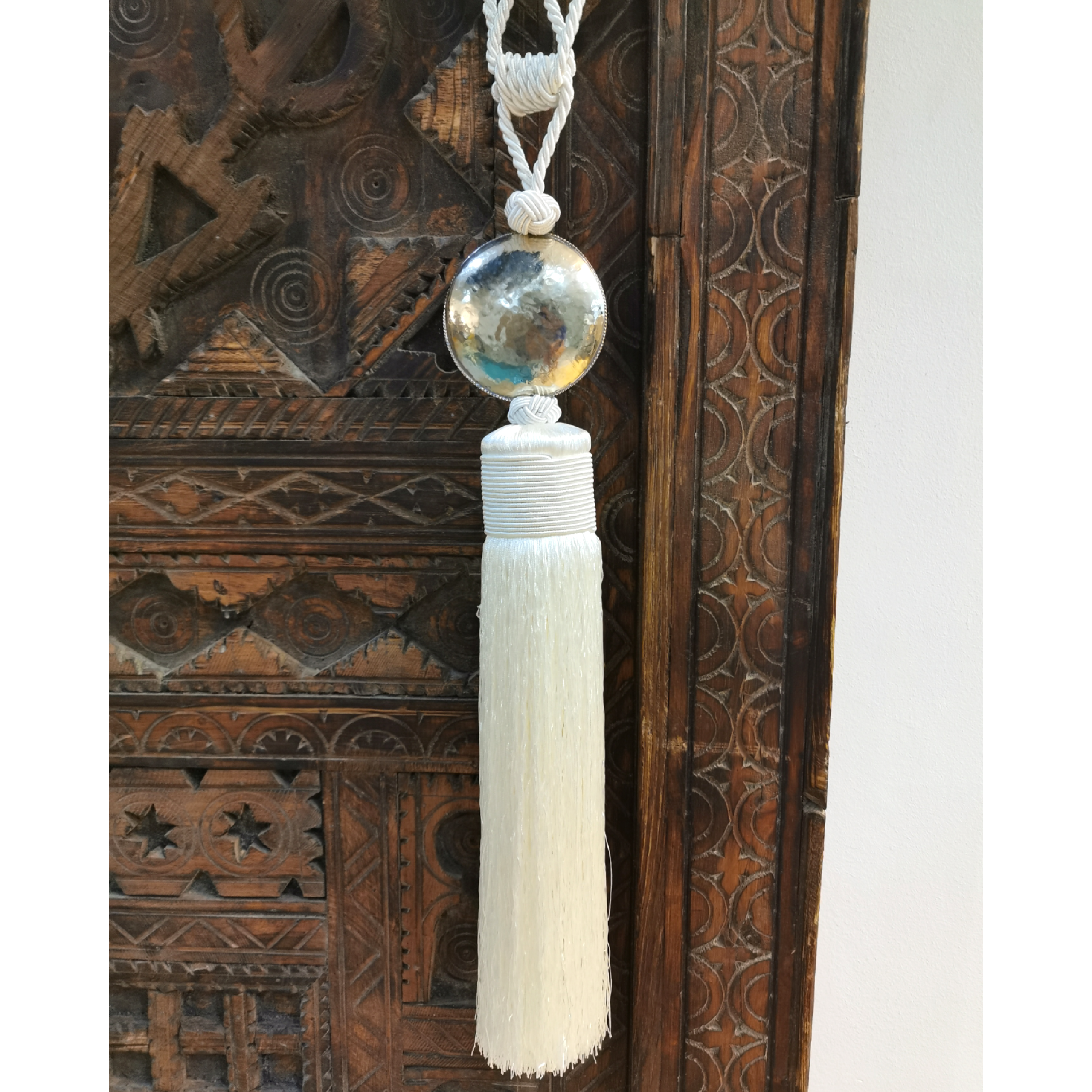 Embrasse décorative artisanale au pompon soyeux, rehaussée d’un bijou rond en maillechort. Une pièce élégante et raffinée pour sublimer portes, échelles ou éléments décoratifs dans un esprit bohème.