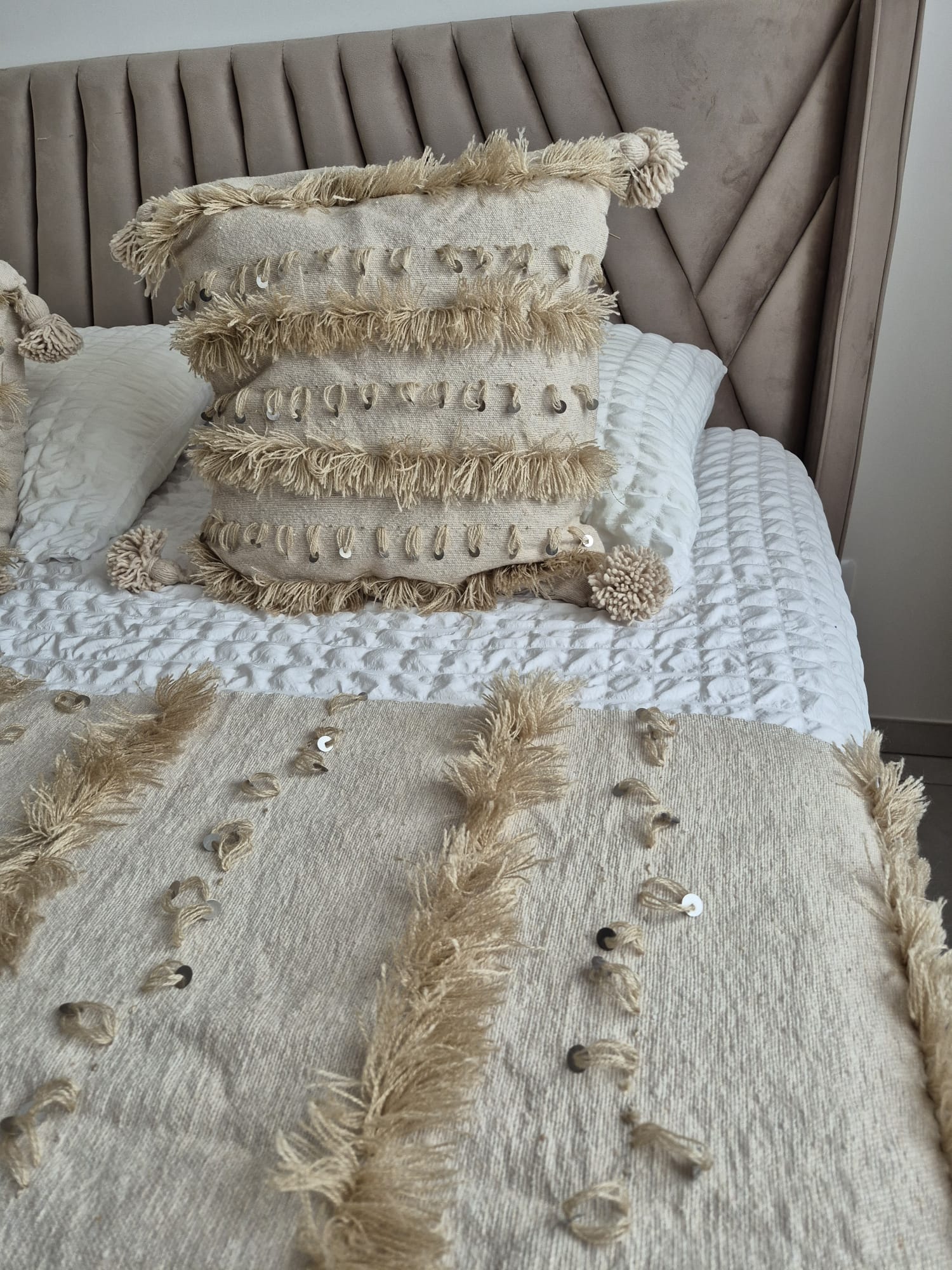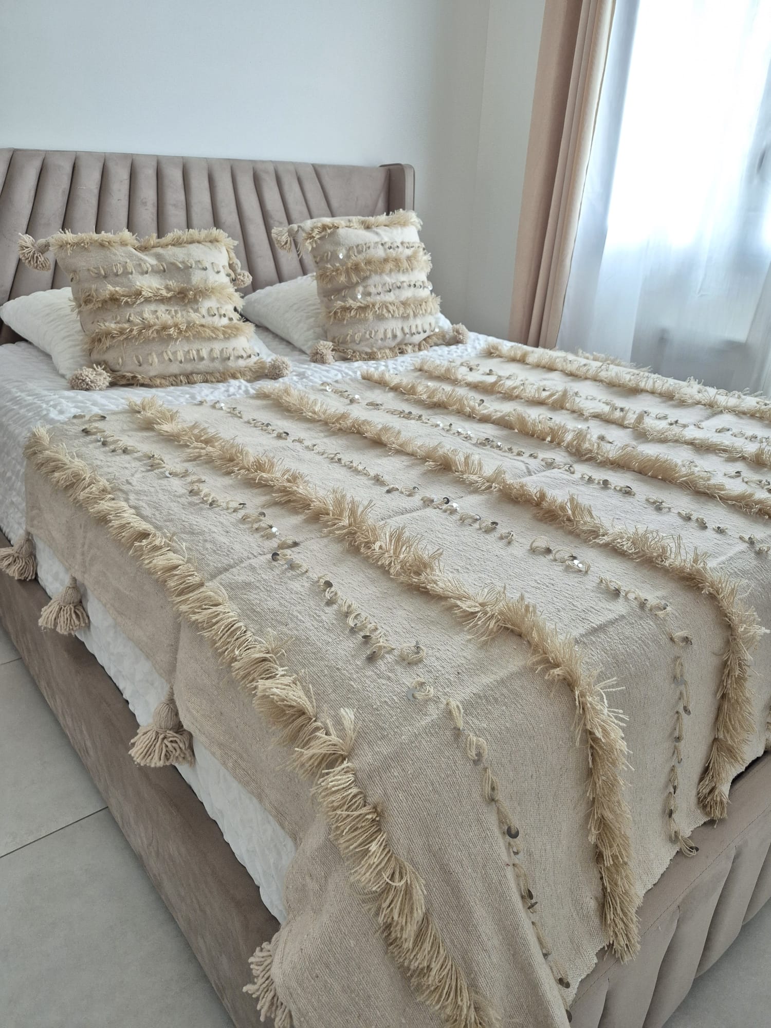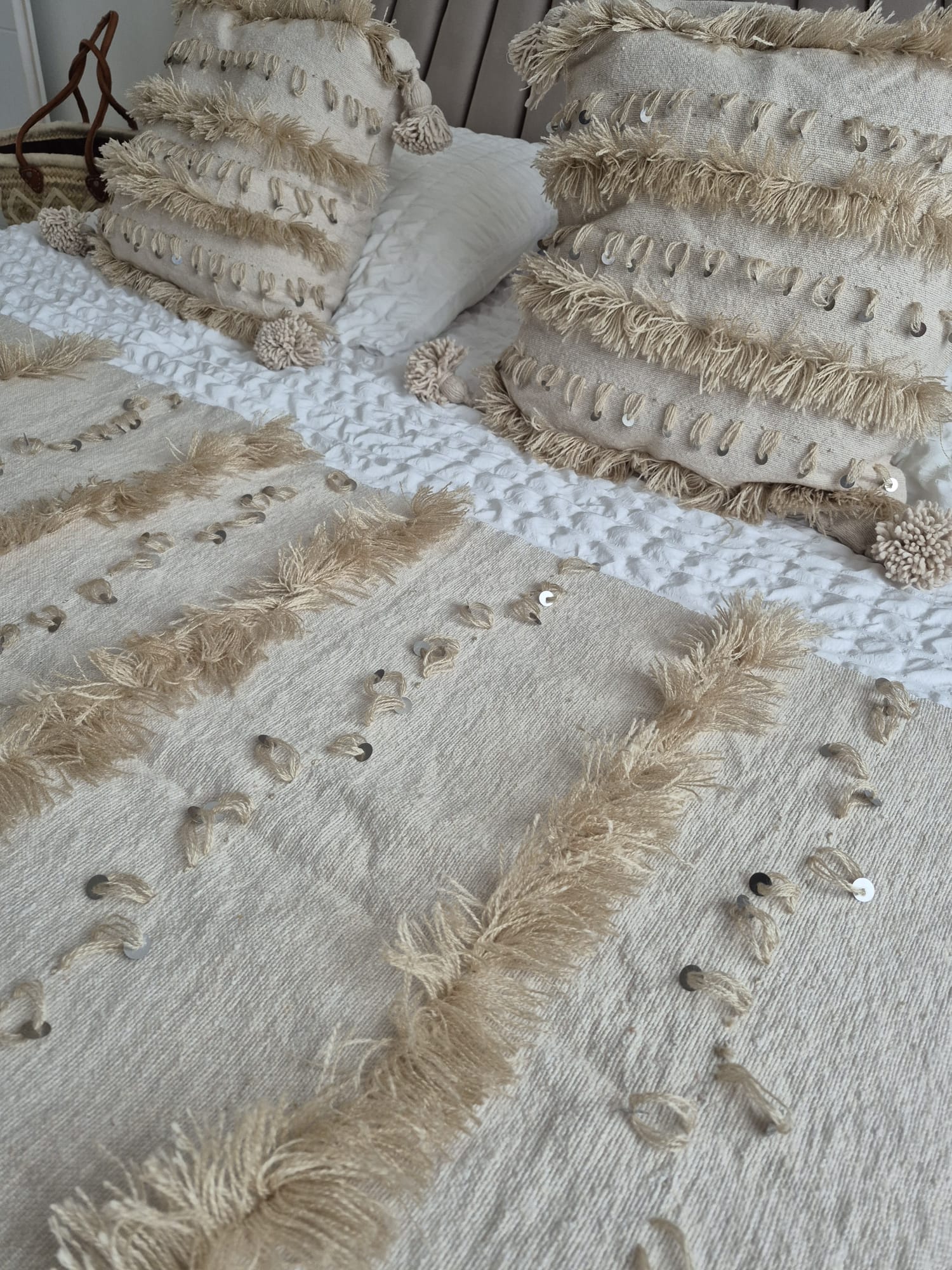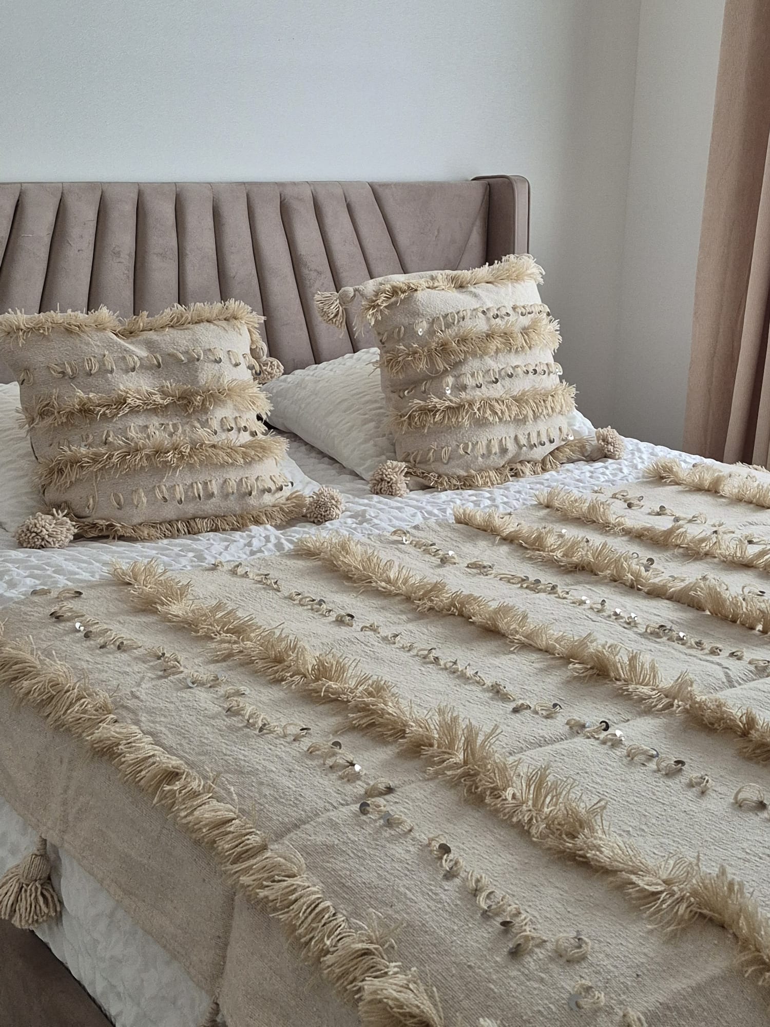 Ensemble Couvre-lit / Plaid & Deux Coussins – Handira Beige