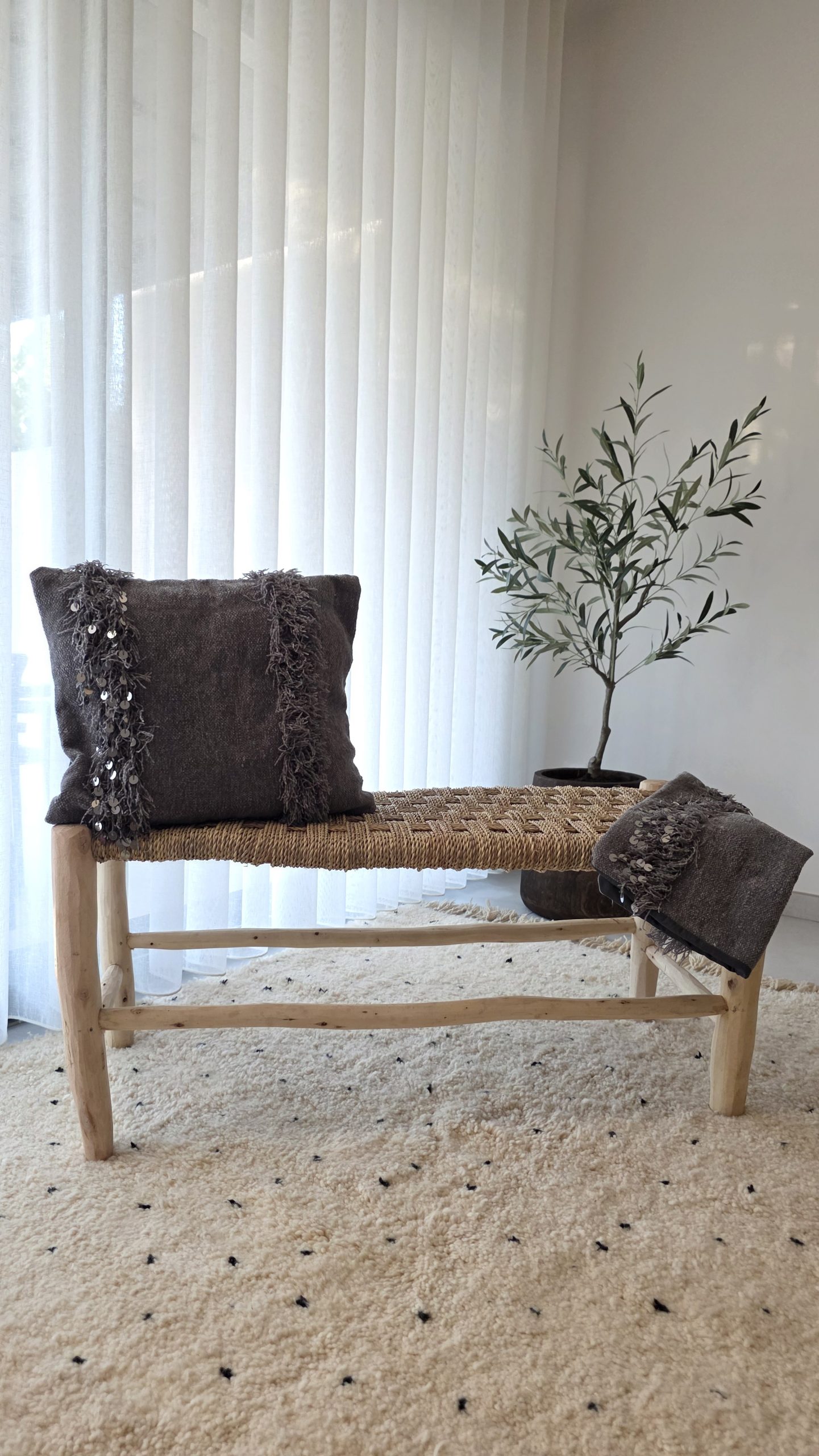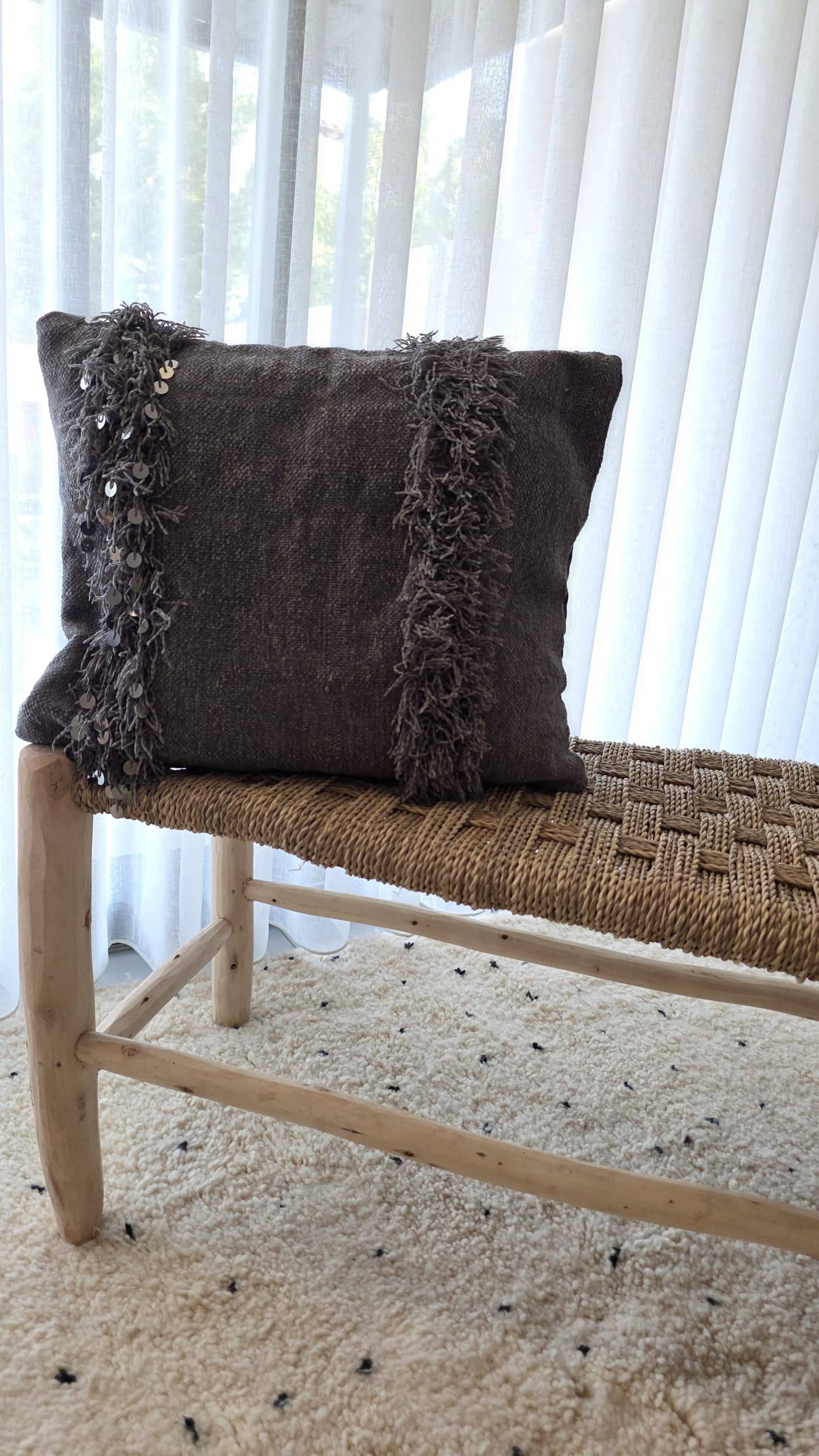 La housse de coussin Alia séduit par sa teinte gris profond et son élégance sobre, rehaussée de délicats détails handira cousus à la main.