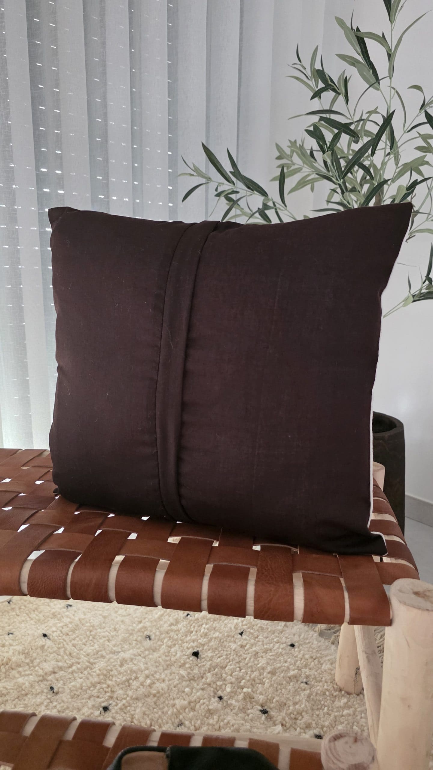 Le dos uni marron apporte sobriété et équilibre, permettant à cette housse de s’intégrer facilement dans des intérieurs bohèmes, ethniques ou contemporains. Plus qu’un simple coussin, c’est un véritable objet décoratif chargé de sens.