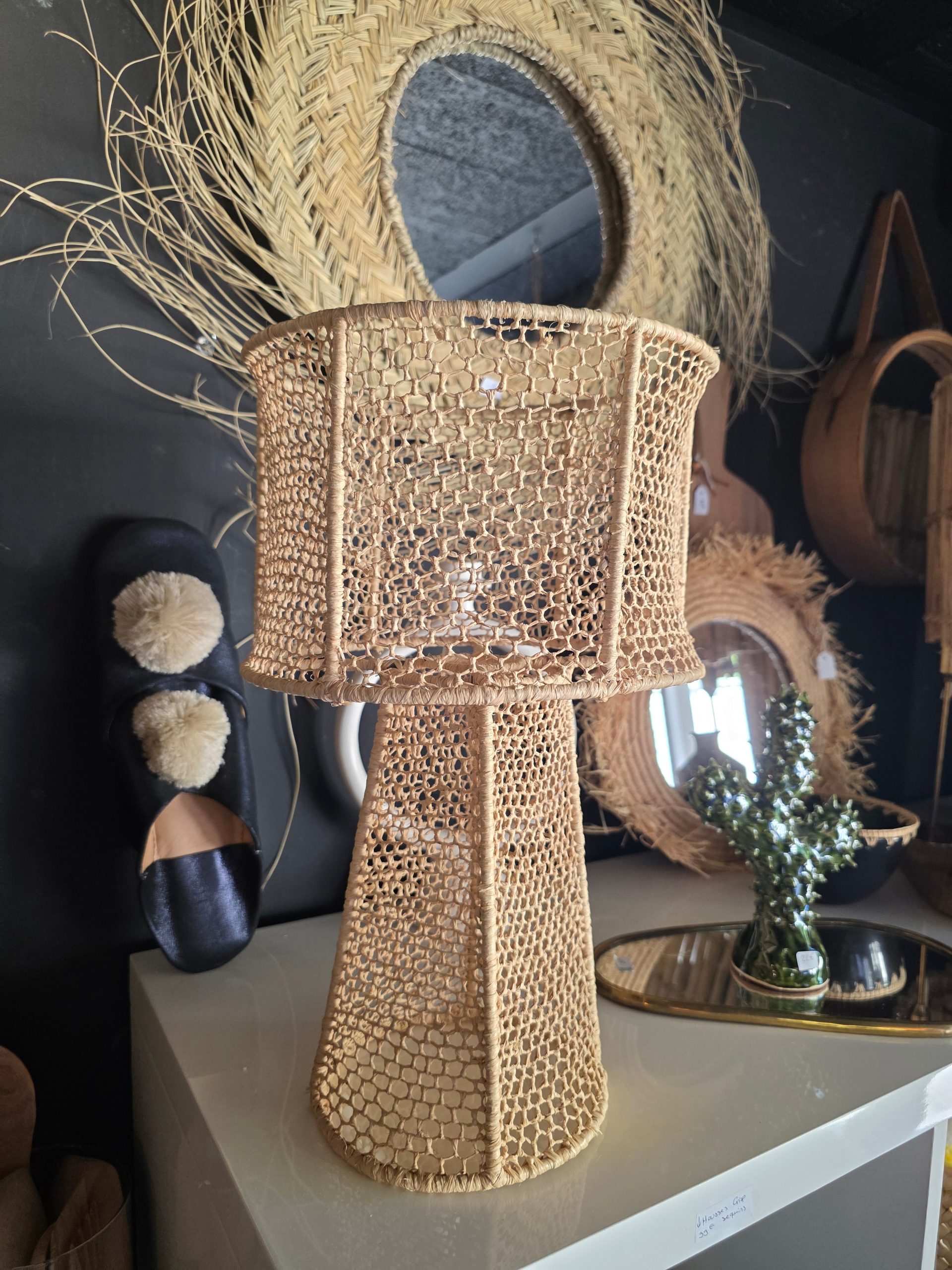 Lampe à poser Assiya en fibre naturelle tressée à la main. Son design ajouré allie modernité et tradition pour une lumière douce et chaleureuse.