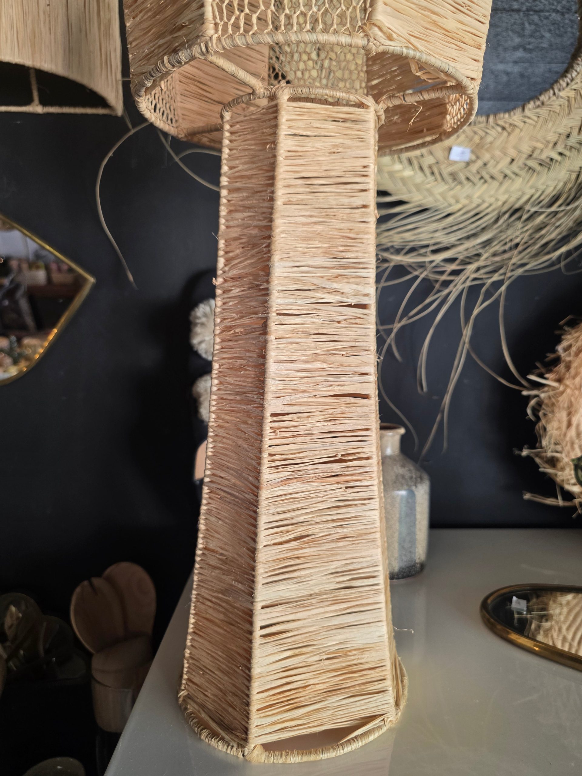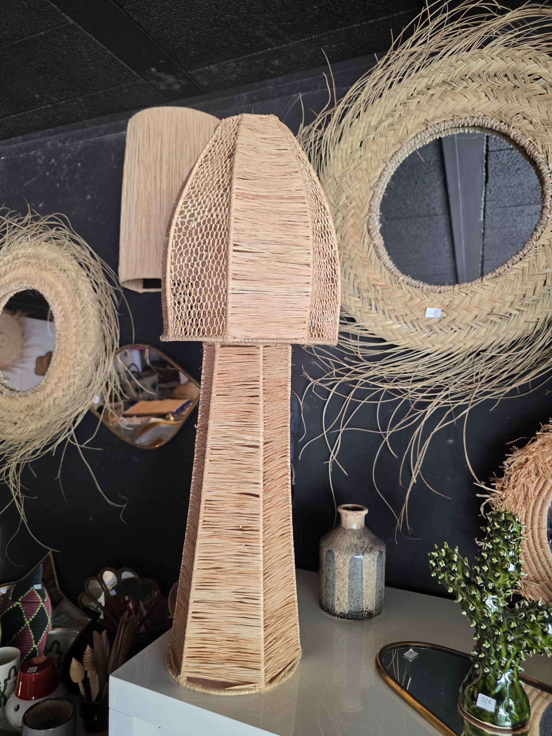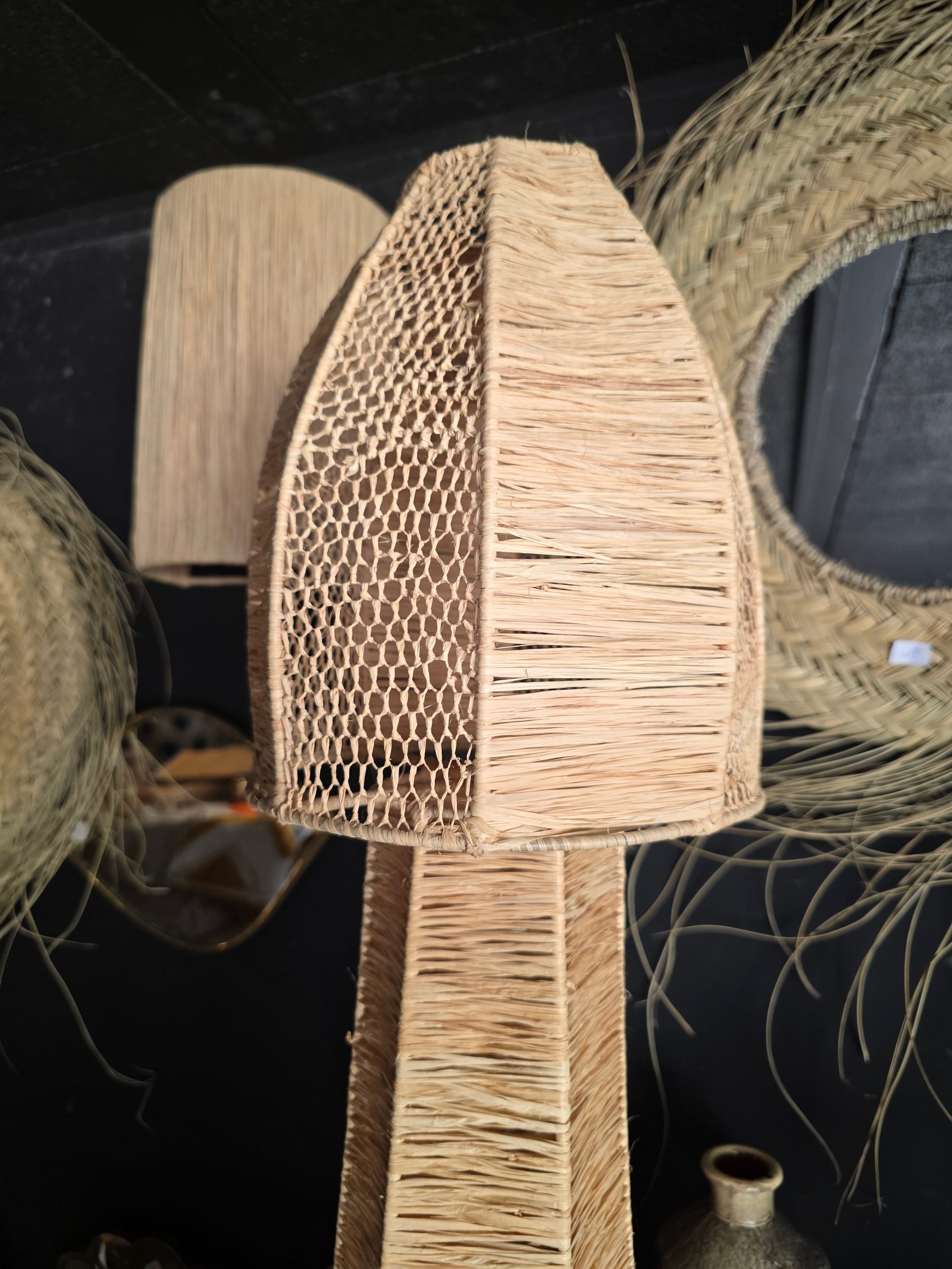 Lampe Zahra en fibre naturelle tressée, au design sculptural et ajouré. Une lumière douce et chaleureuse pour sublimer les intérieurs contemporains et bohèmes.