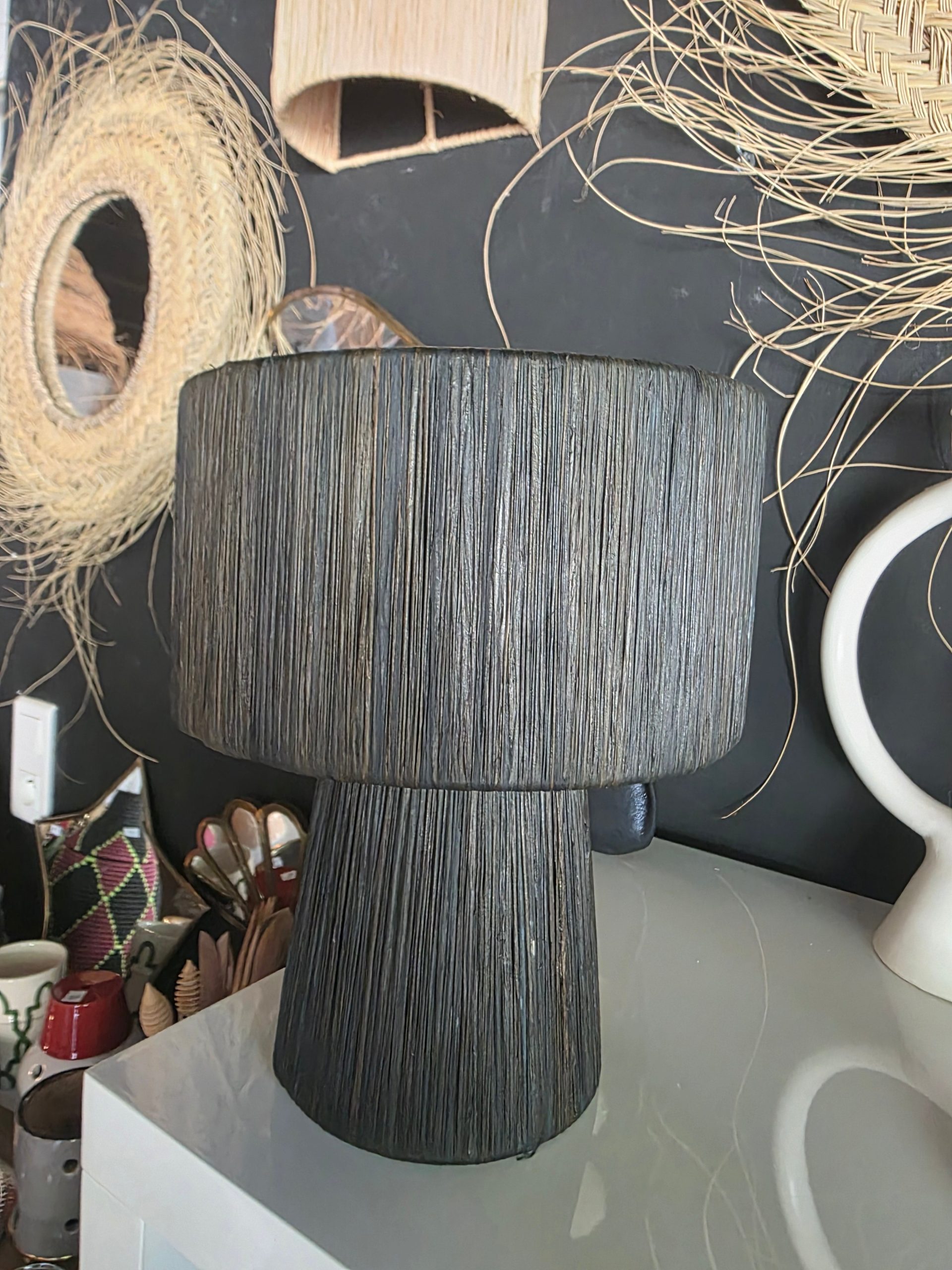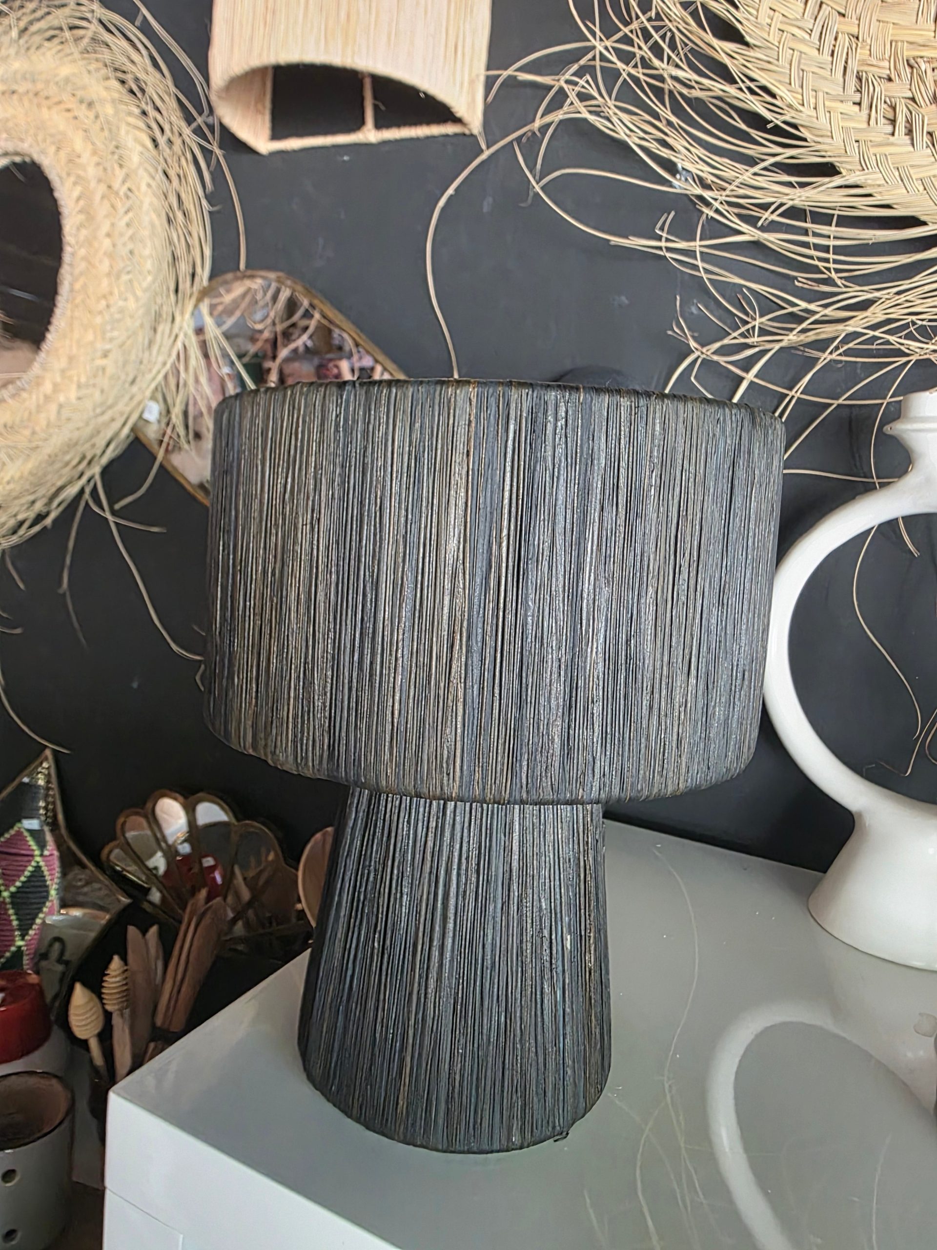 Lampe Nouria en fibre naturelle teinte noire. Tressée à la main, elle diffuse une lumière douce et chaleureuse tout en ajoutant une touche de caractère chic.