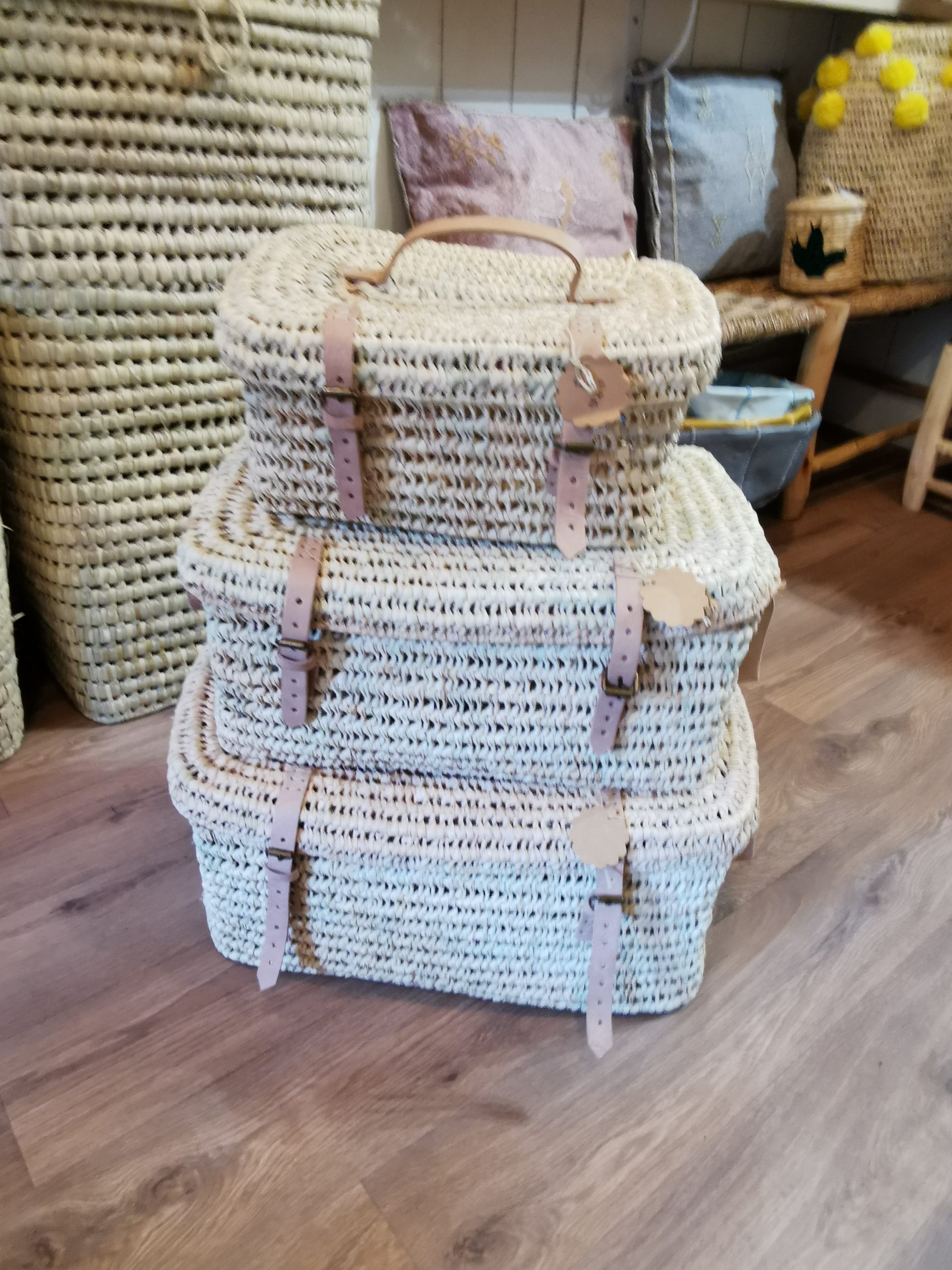 Malle en osier tressée à la main avec fermeture en cuir, idéale pour ranger jouets, accessoires ou linge léger tout en apportant une touche bohème naturelle à votre intérieur.