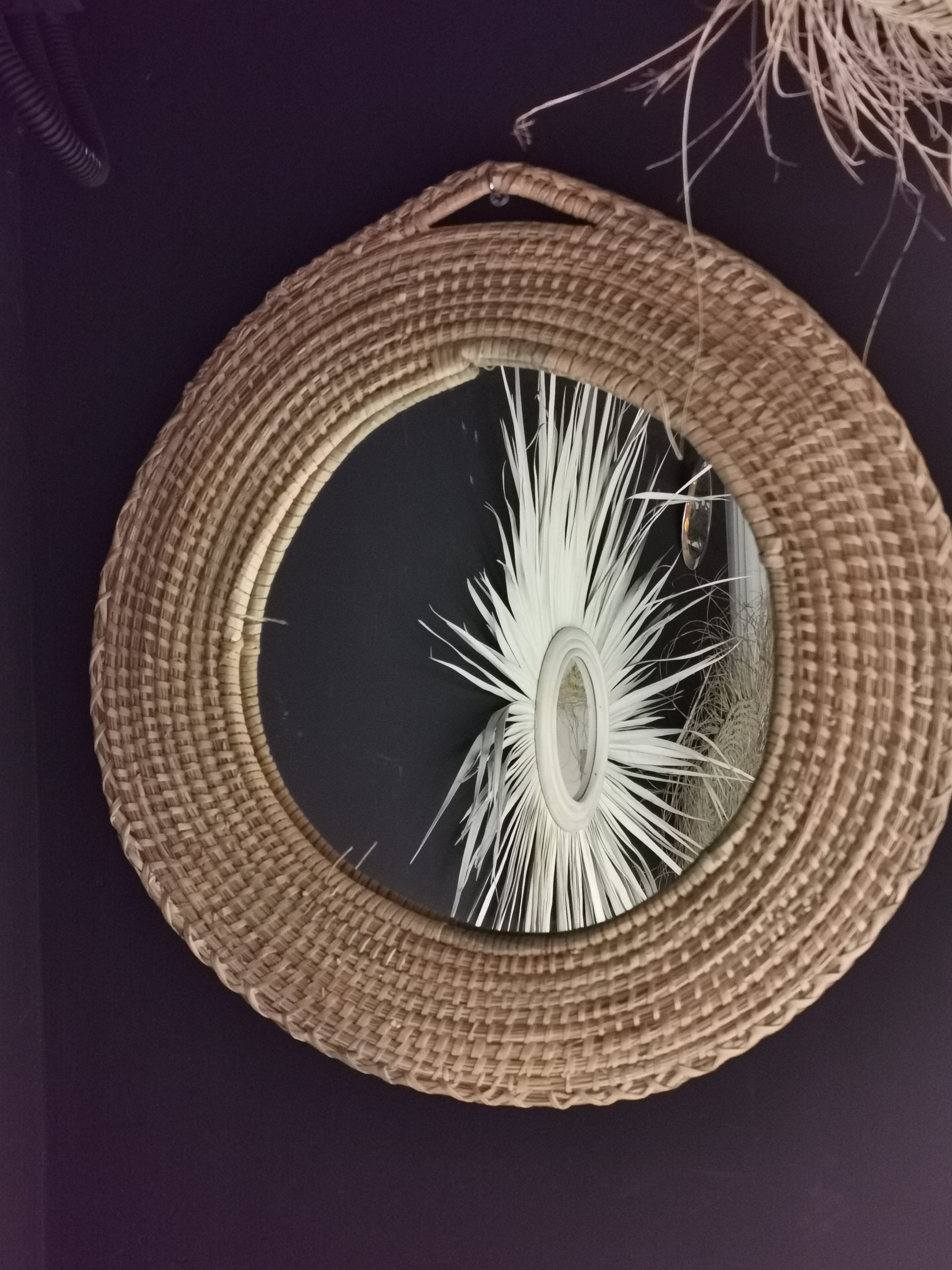 Le miroir artisanal marocain Mina est confectionné à la main à partir de feuilles de palmier tressées selon un savoir-faire traditionnel.