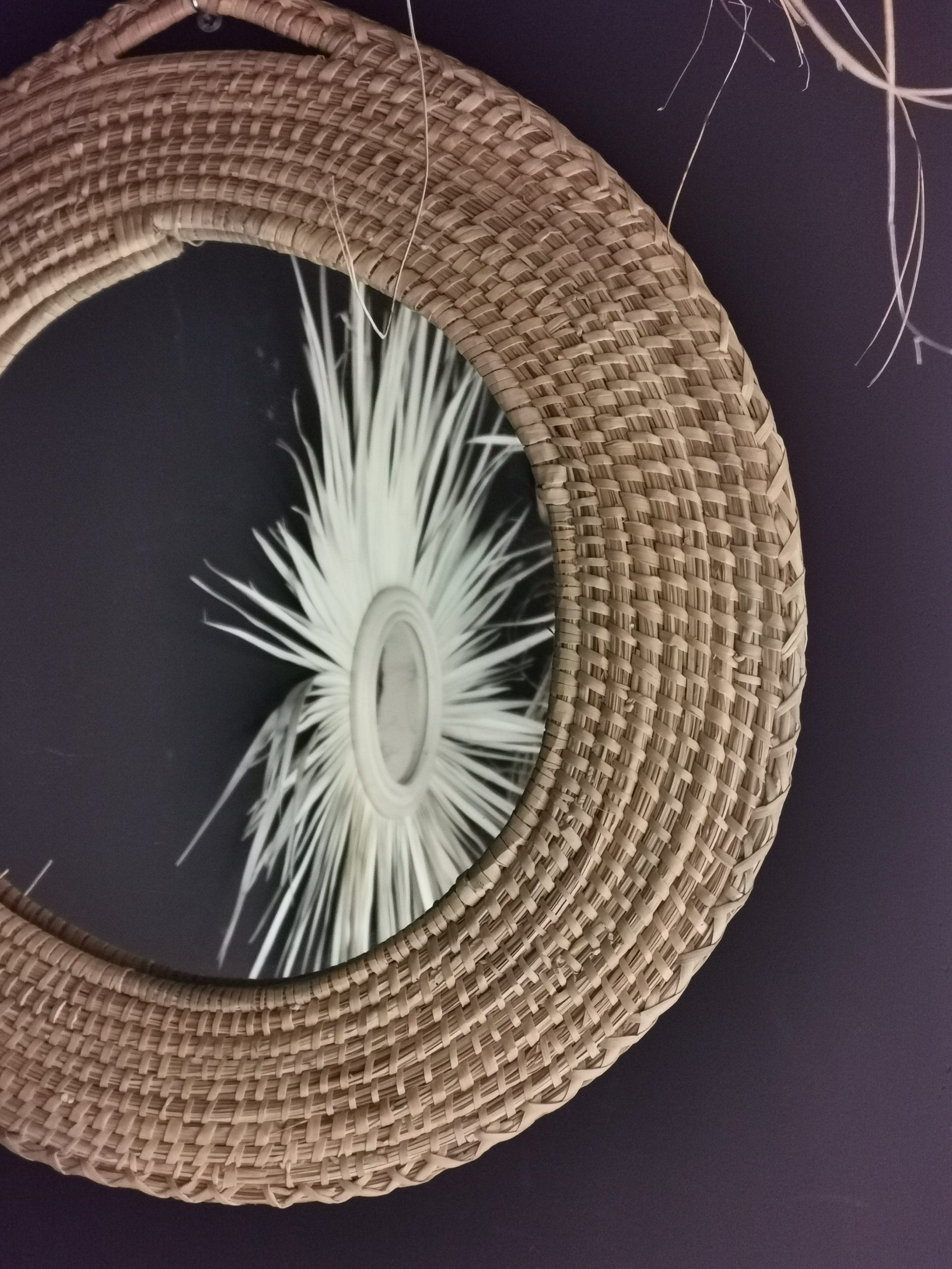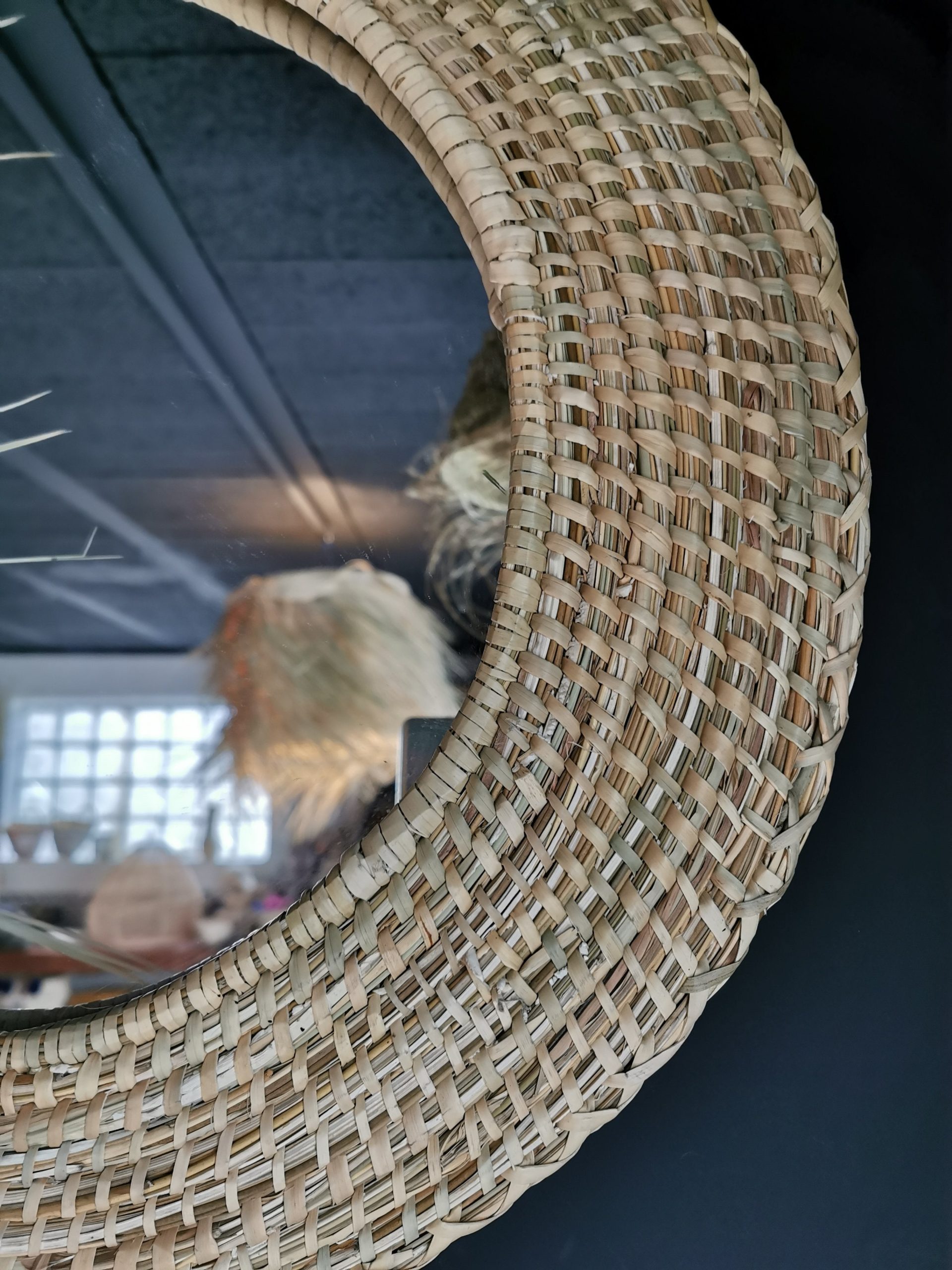 Miroir artisanal en feuille de palmier tressée, Ø58 cm, avec un centre miroir de 35 cm. Un design naturel et raffiné, façonné à la main au Maroc.