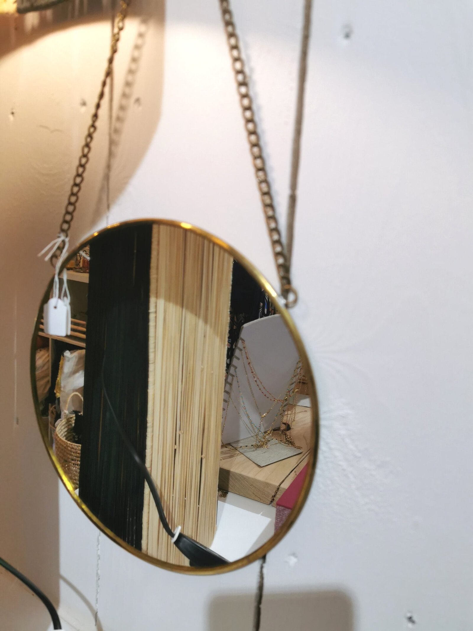 Miroir rond en laiton suspendu, façonné à la main au Maroc. Élégant et minimaliste, il apporte lumière et raffinement à votre intérieur.