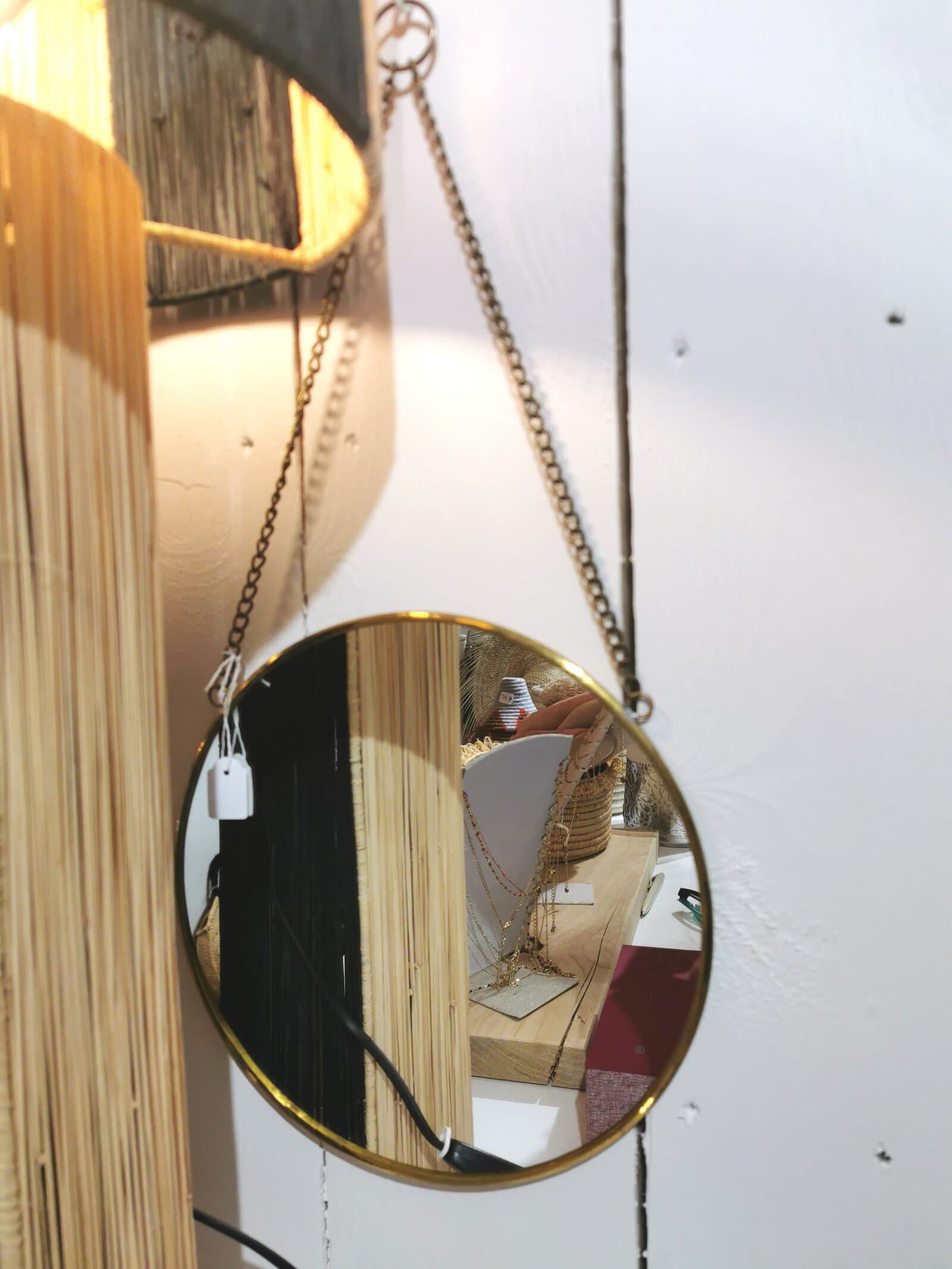 Associez ce miroir suspendu en laiton à d’autres éléments en fibres naturelles ou en bois clair