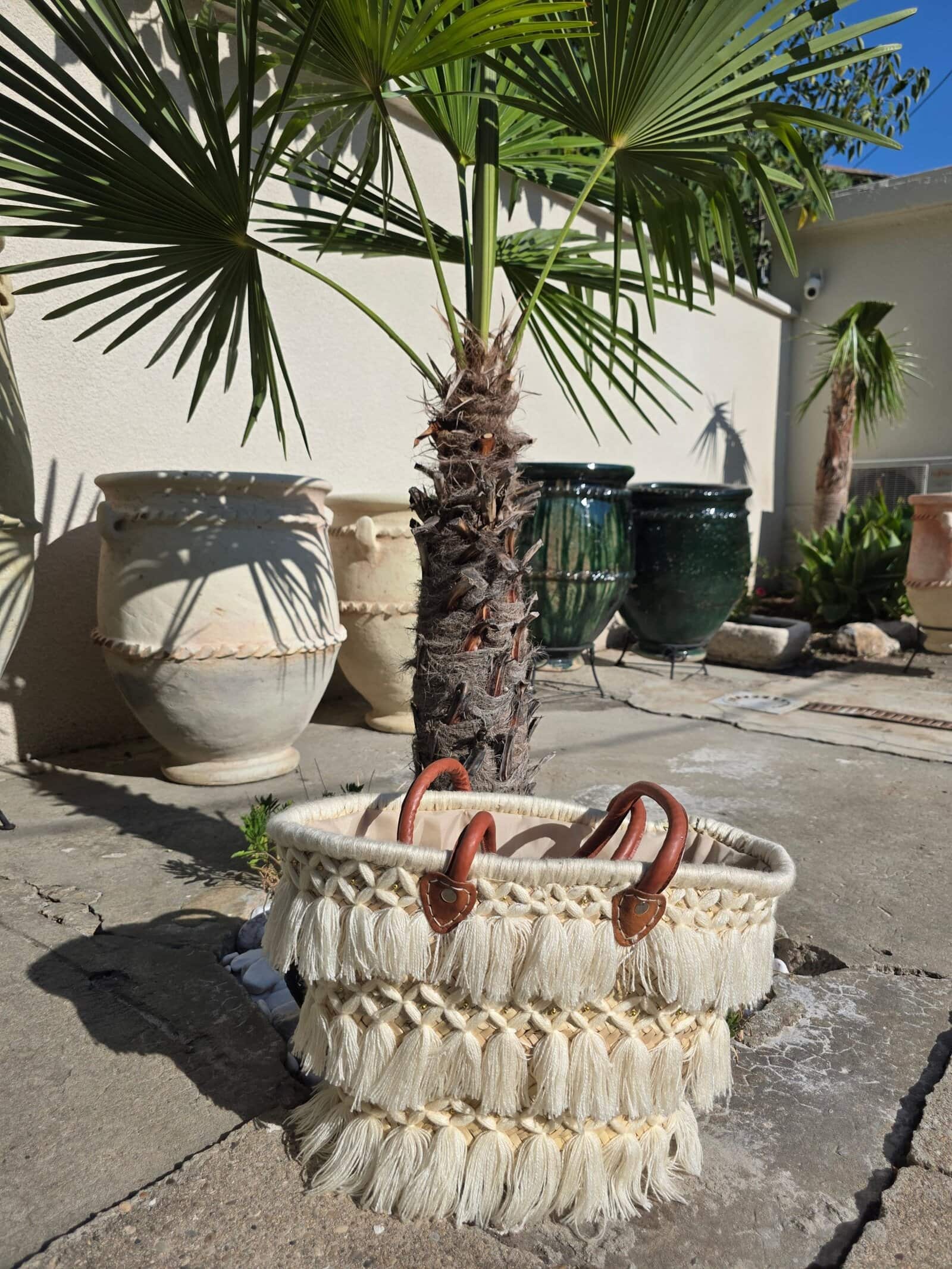 Panier artisanal en fibres naturelles, sublimé par des pompons écrus et doté d’anses en cuir. Une pièce élégante au charme bohème, pensée pour accompagner le quotidien avec raffinement.
