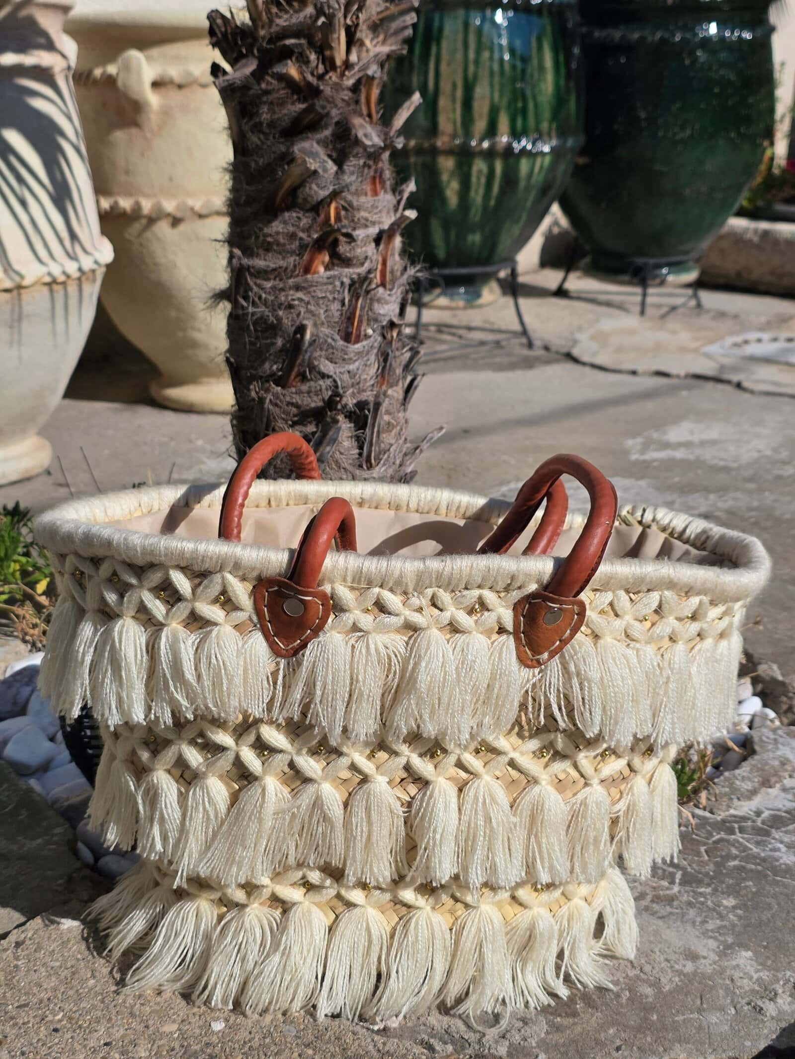 Ses pompons écrus superposés apportent un volume doux et raffiné, tandis que ses anses en cuir véritable assurent confort et solidité. Un panier à la fois pratique, décoratif et terriblement tendance.