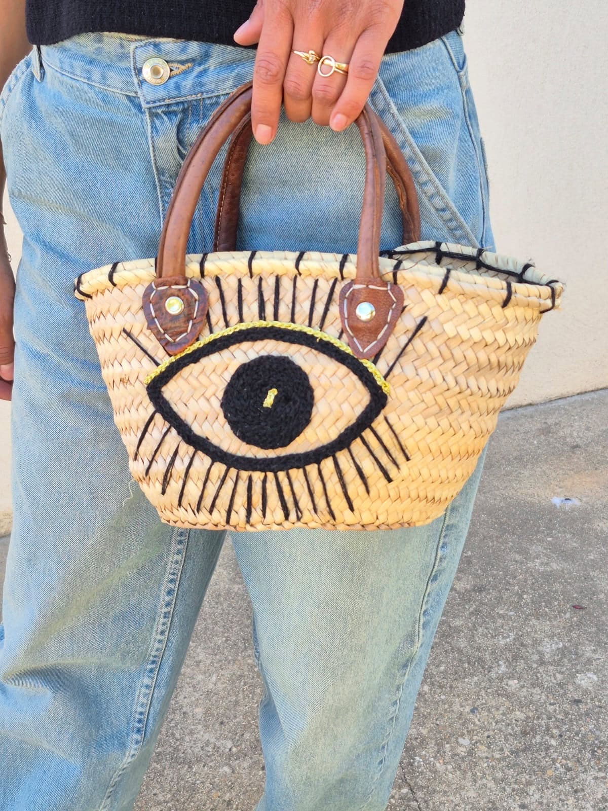 Petit panier bohème décoré d’un œil protecteur, avec anses en cuir, idéal pour accompagner vos tenues estivales.
