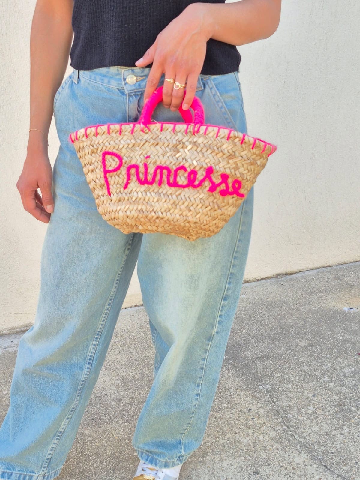 Petit panier tressé à la main en doum naturel, personnalisé « Princesse », parfait pour une enfant, une sortie ou une jolie idée cadeau bohème.