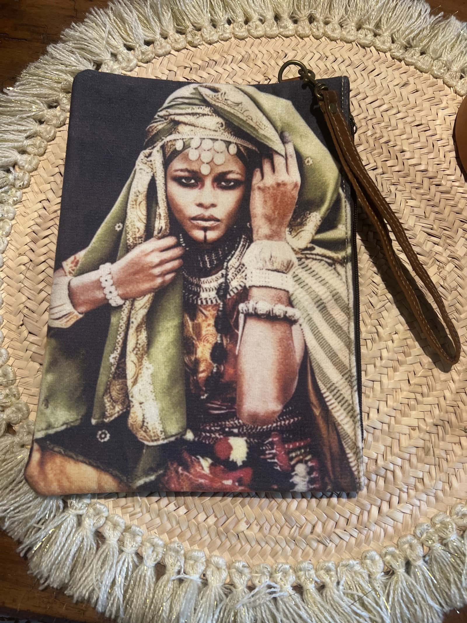 Pochette artisanale illustrée avec anse en cuir, idéale à porter à la main ou au poignet pour une touche bohème affirmée.