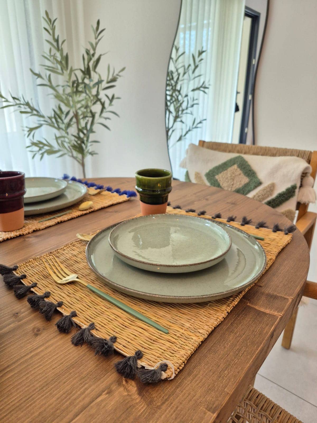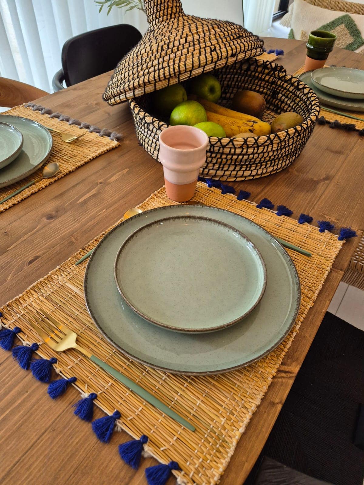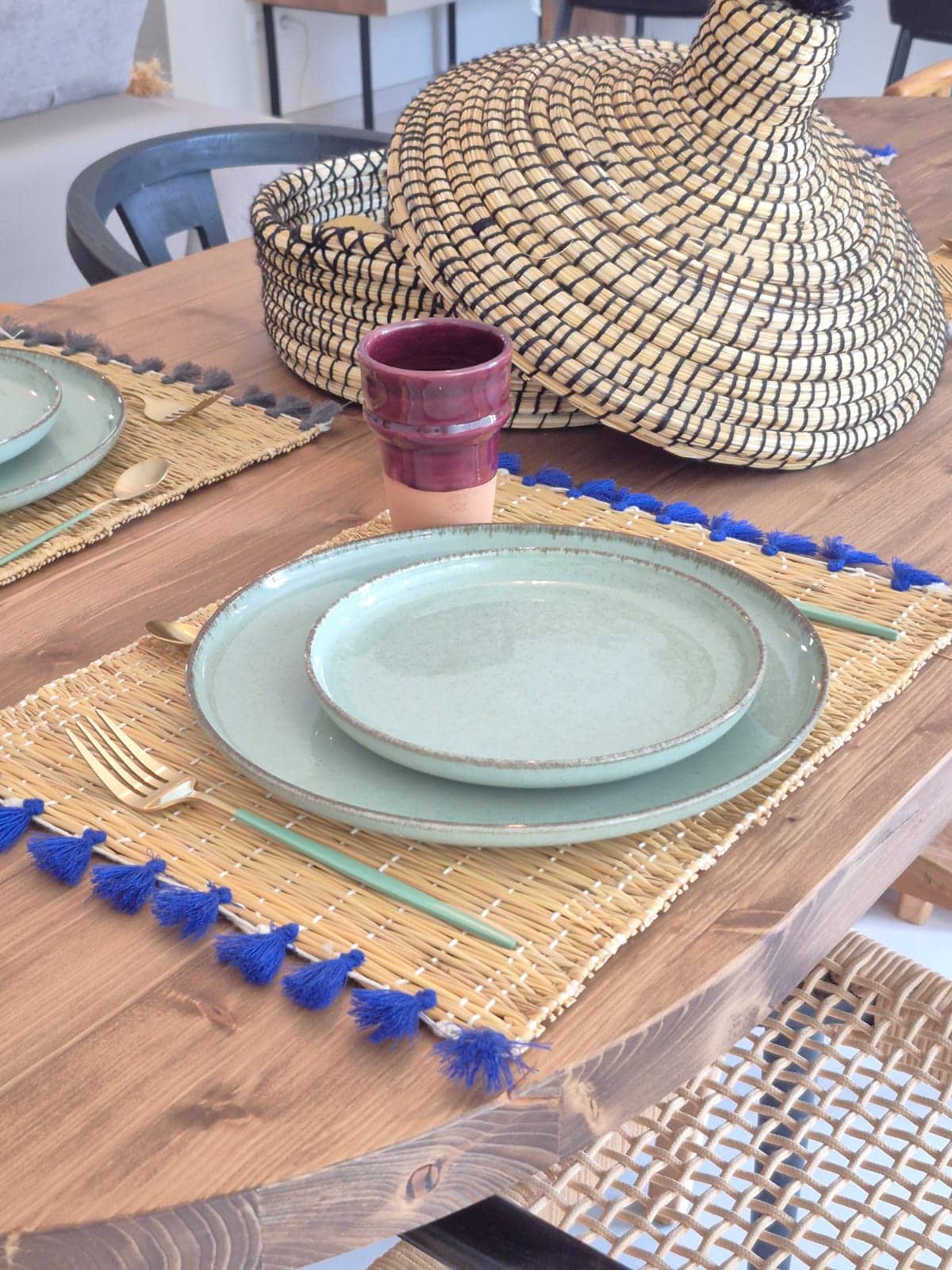 Set de table en paille naturelle avec pompons, fait main au Maroc. Idéal pour une décoration de table bohème, chaleureuse et élégante.