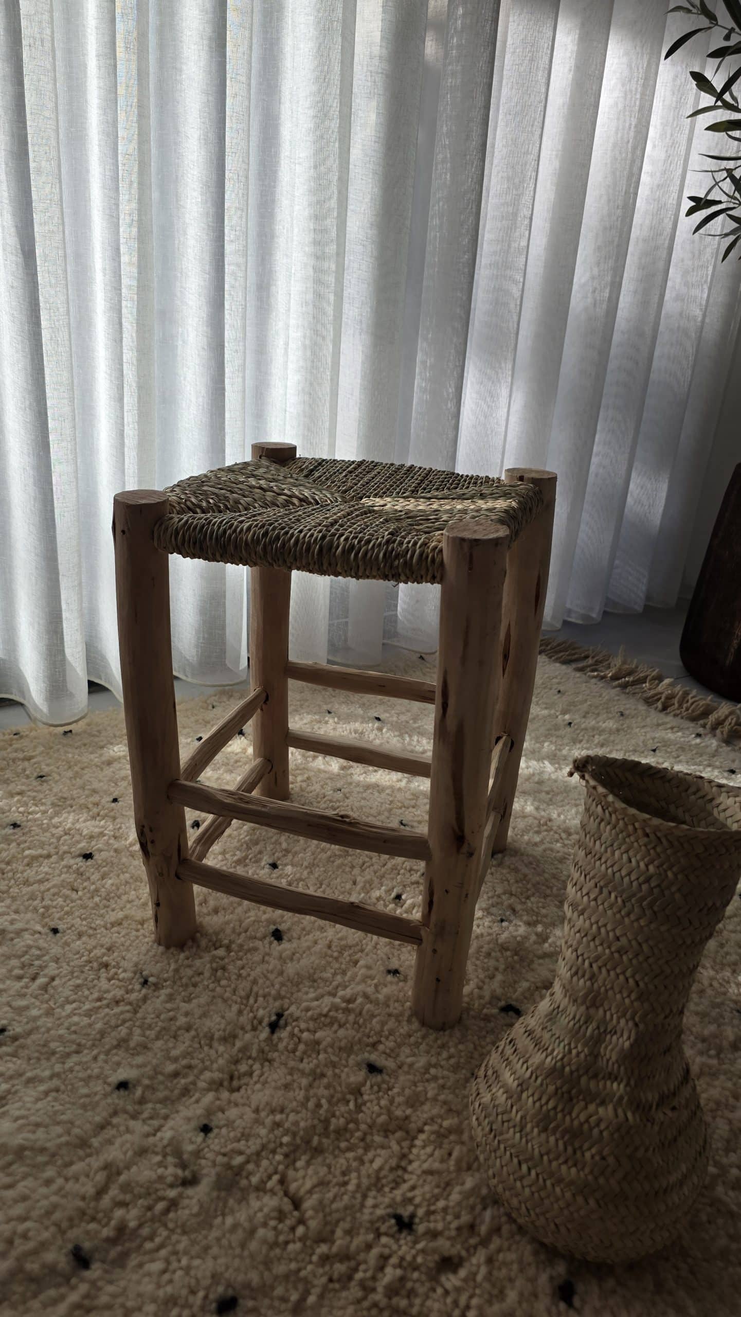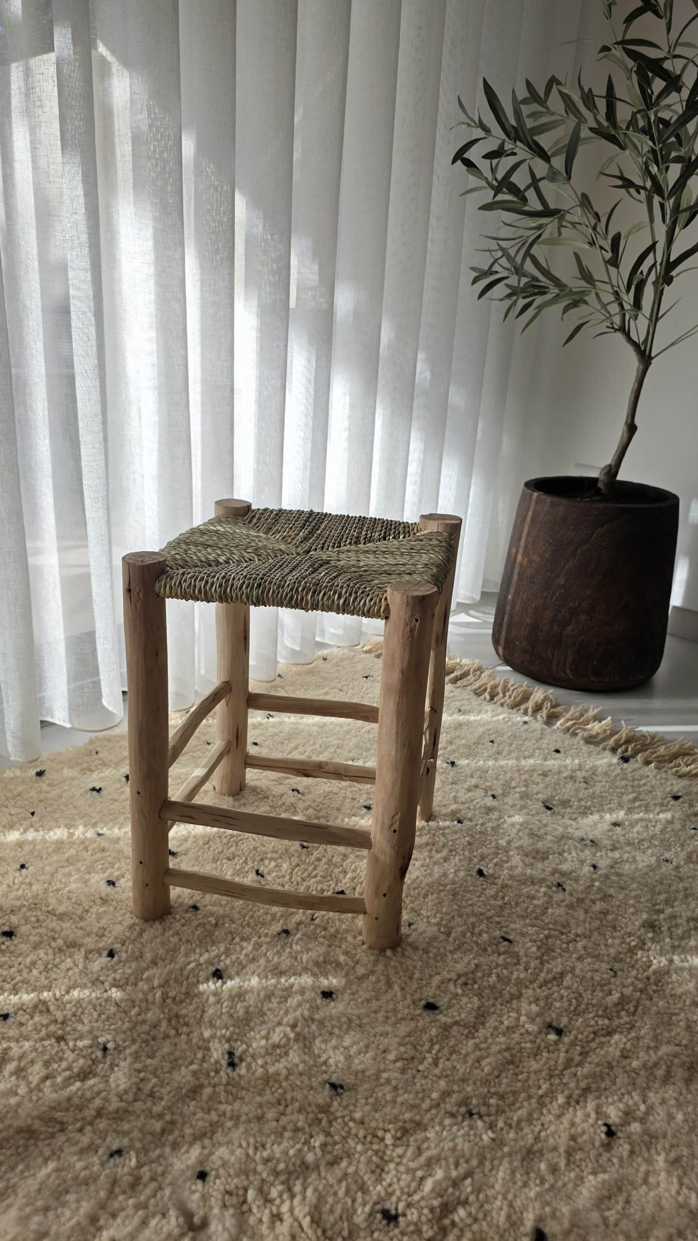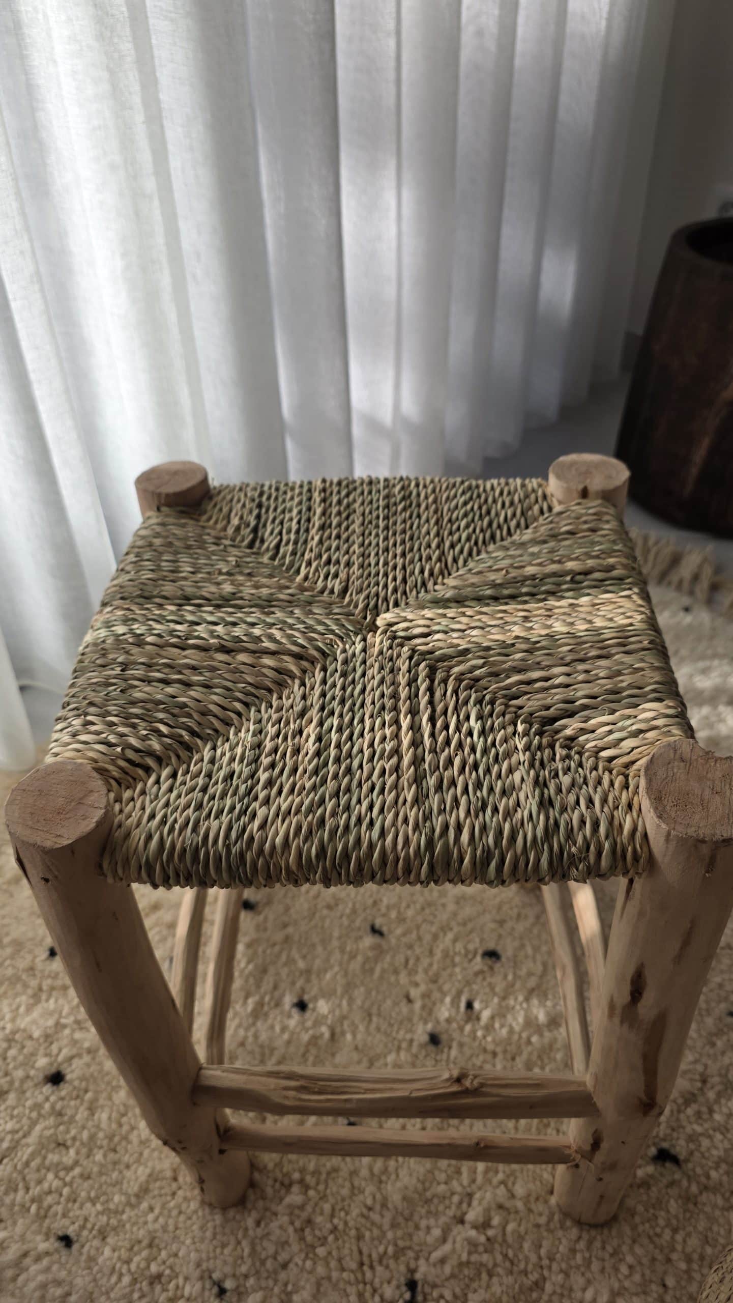 Tabouret artisanal en bois brut et doum tressé, à l’allure naturelle et authentique. Une pièce idéale en assise d’appoint ou en élément décoratif dans un intérieur bohème ou méditerranéen.