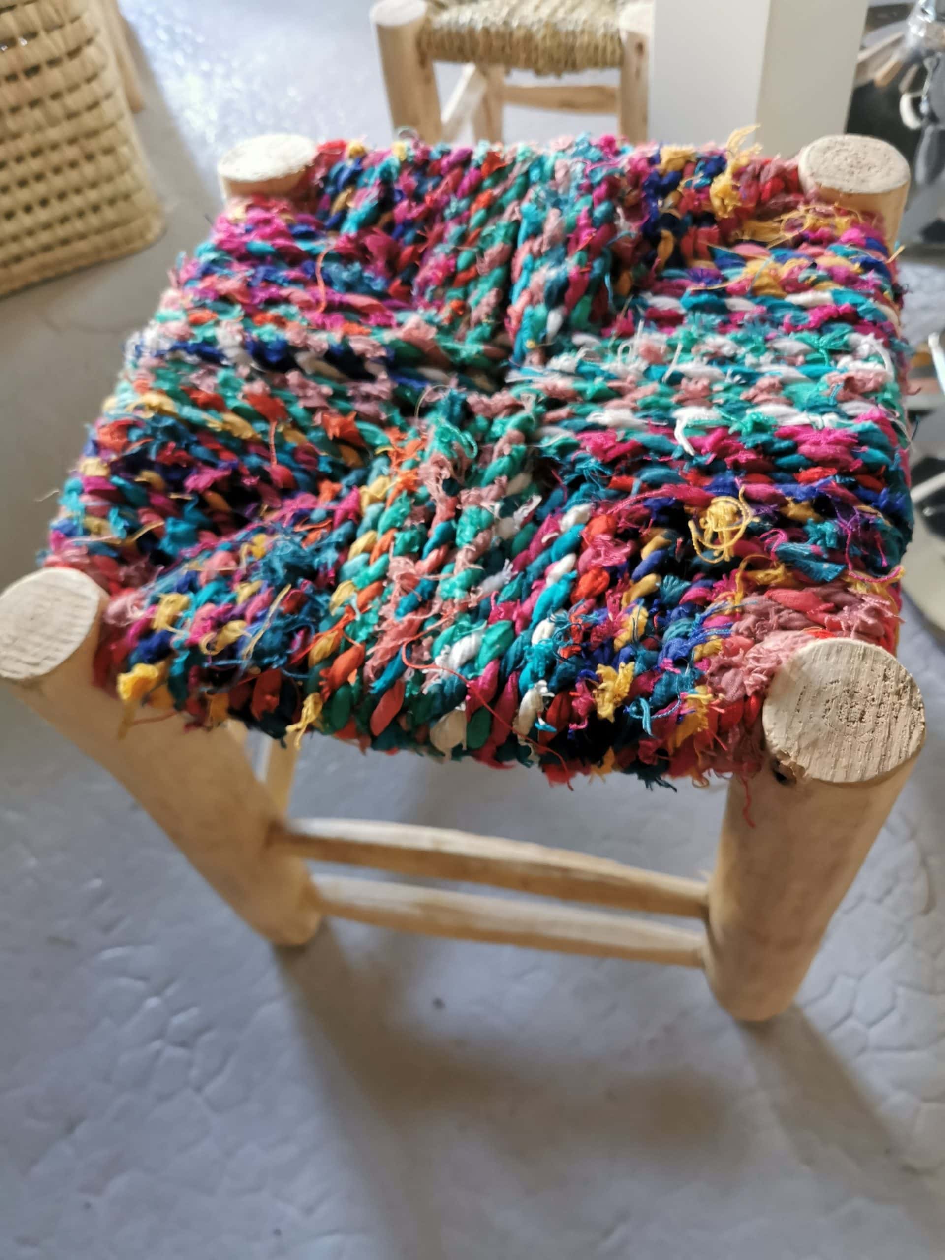 Tabouret Boucherouite artisanal en bois d’eucalyptus, pièce unique aux couleurs vibrantes pour sublimer un intérieur bohème et chaleureux.