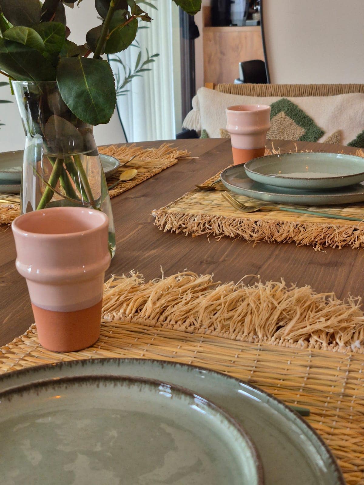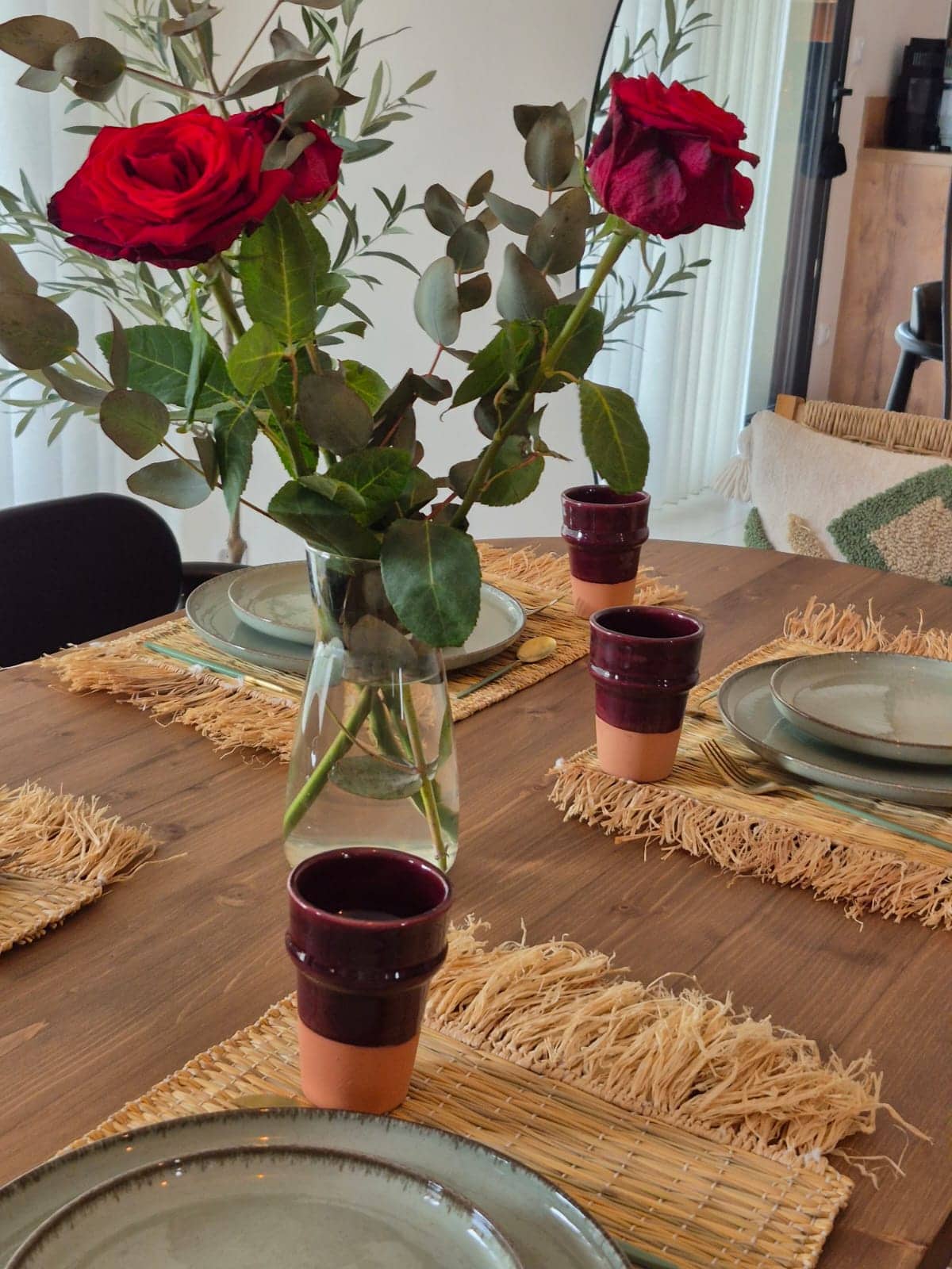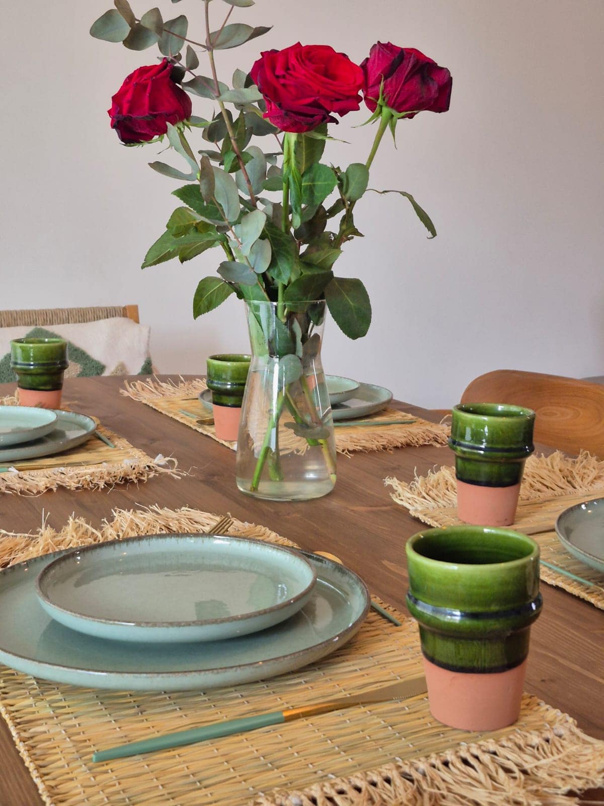 Déclinée en plusieurs coloris délicats — noir, rose pâle, bordeaux, vert et gris — elle permet de créer des tables harmonieuses, personnalisées et pleines de caractère. Chaque nuance apporte une ambiance différente tout en conservant l’âme artisanale de la pièce.
