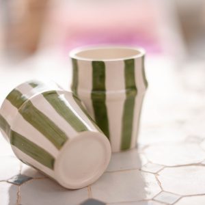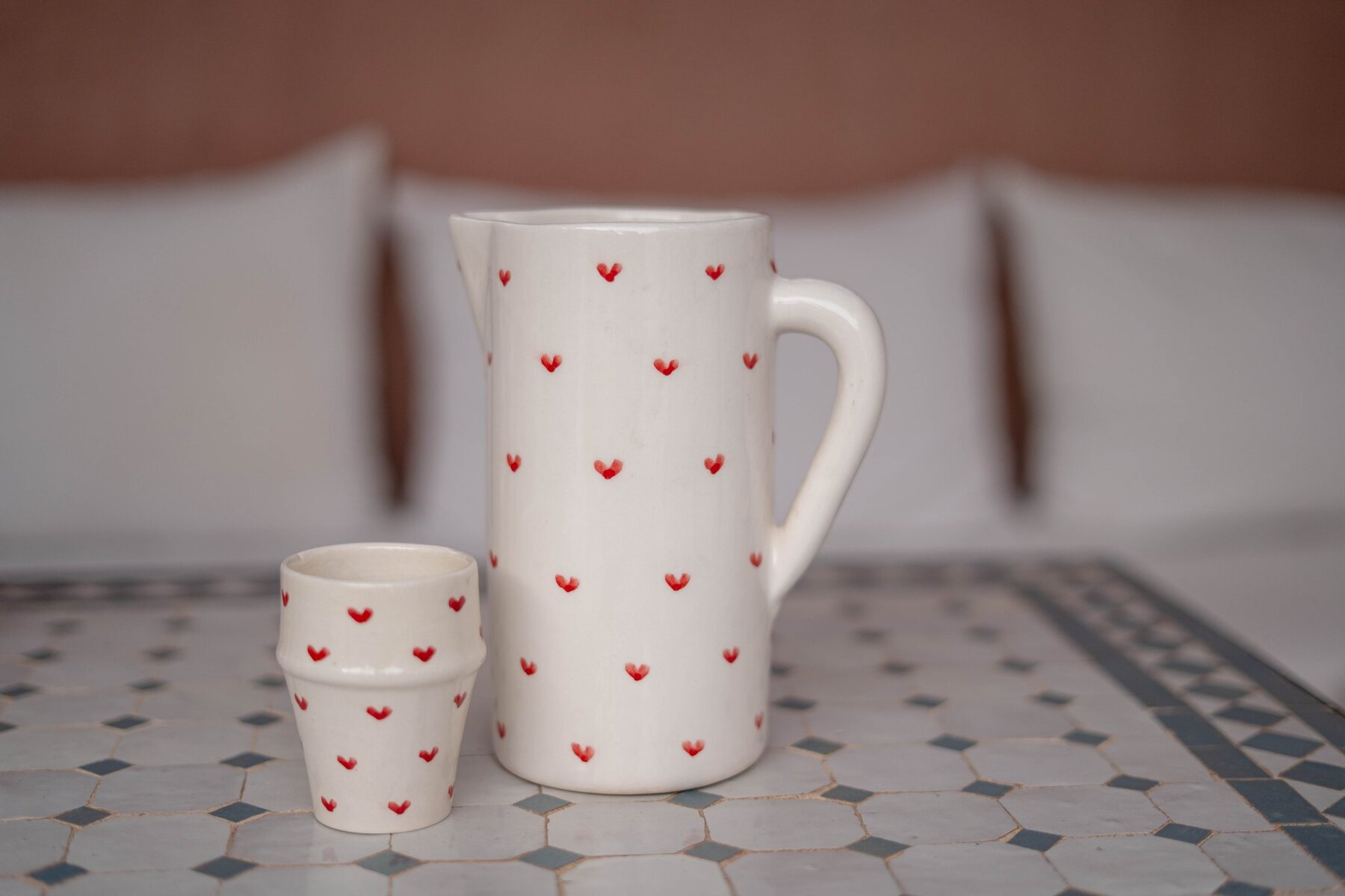 Ce verre en céramique artisanale, décoré de petits cœurs rouges peints à la main, est idéal pour accompagner la carafe ou se mixer avec d’autres pièces pour une table pleine de charme.