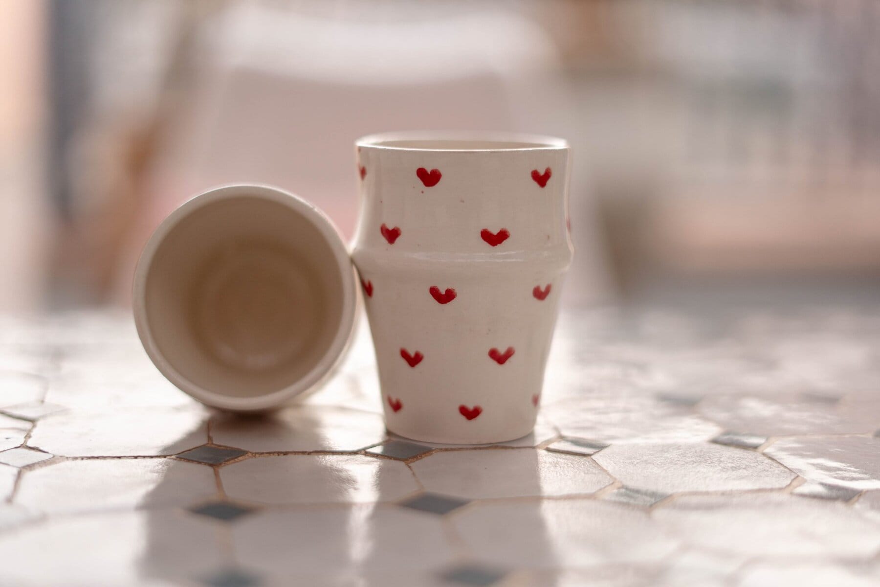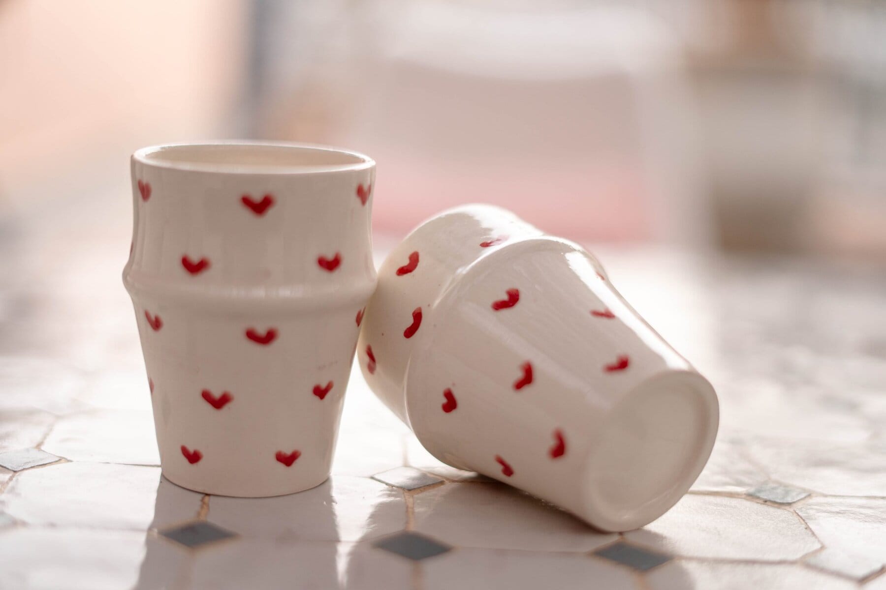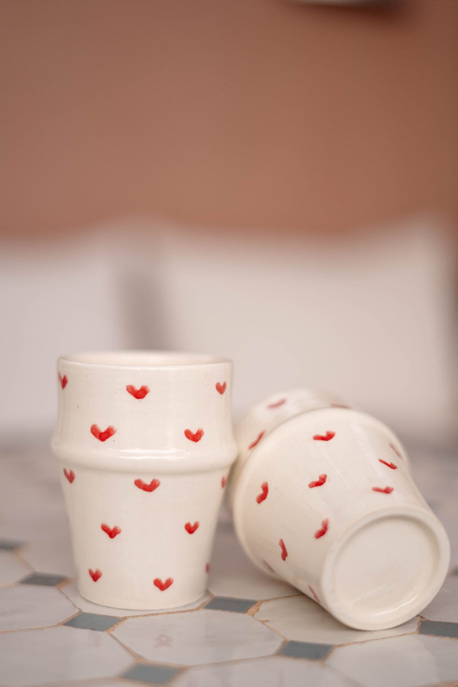 Ces verres en céramique faits main sont pensés pour un usage quotidien tout en restant décoratifs. Leur motif délicat de cœurs rouges apporte une touche douce et joyeuse à vos moments de partage.
